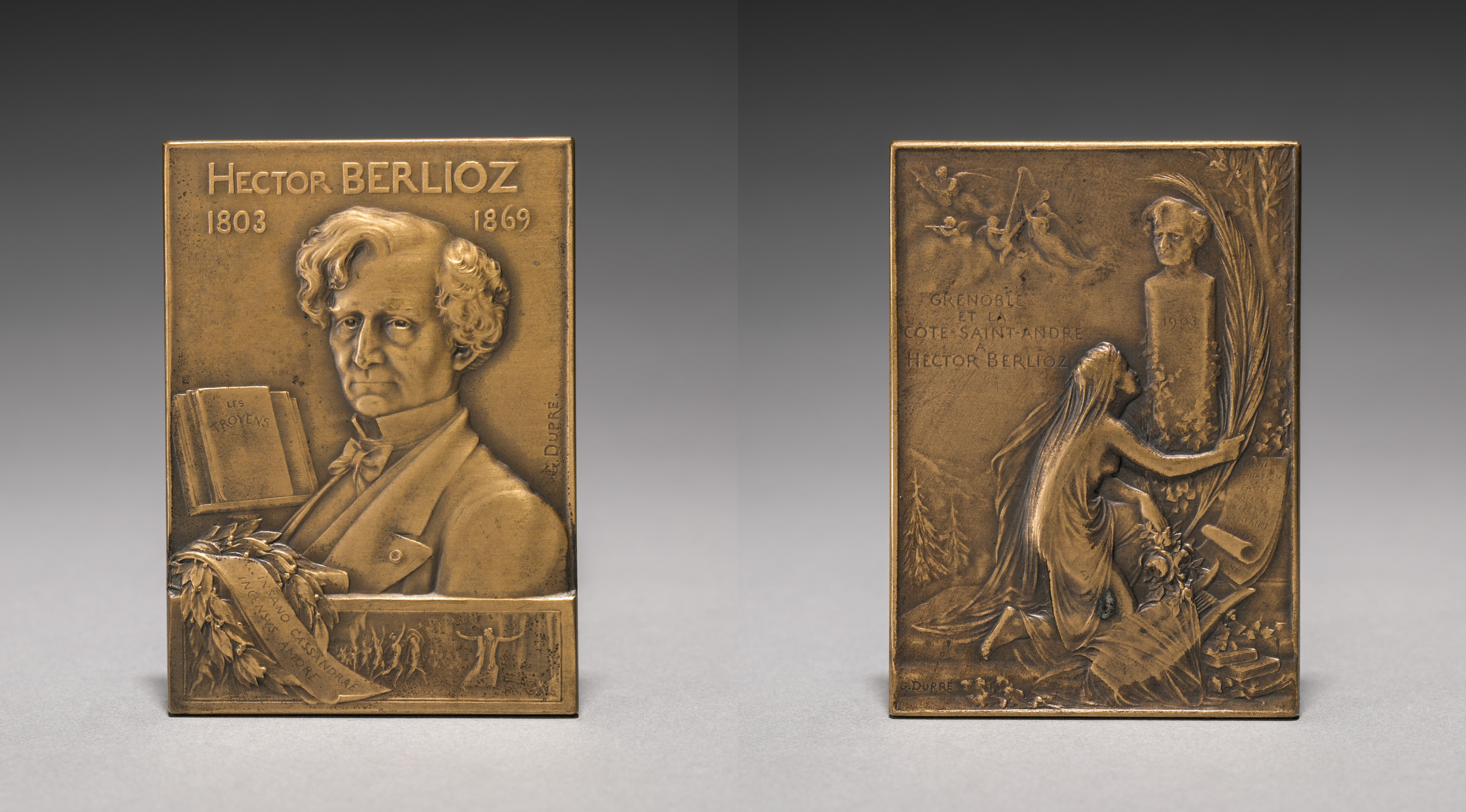 Medallion by Georges Dupré. Rectangular bronze medallion with a portrait of a man with curly hair and a high collar on the left side, and a scene of a woman kneeling next to a tomb on the right side. The left side shows the man with a book, wearing a suit with a cravat. He has curly hair and a serious expression. Above him are the words "HECTOR BERLIOZ" and the dates "1803" and "1869". The right side depicts a woman in a long dress kneeling next to a tomb with an inscription. There are flowers and foliage around her. In the background, there are more flowers and a few indistinct figures. The medallion has a bronze color with a smooth surface and raised details. The background of the image is a gradient from dark gray at the top to light gray at the bottom.