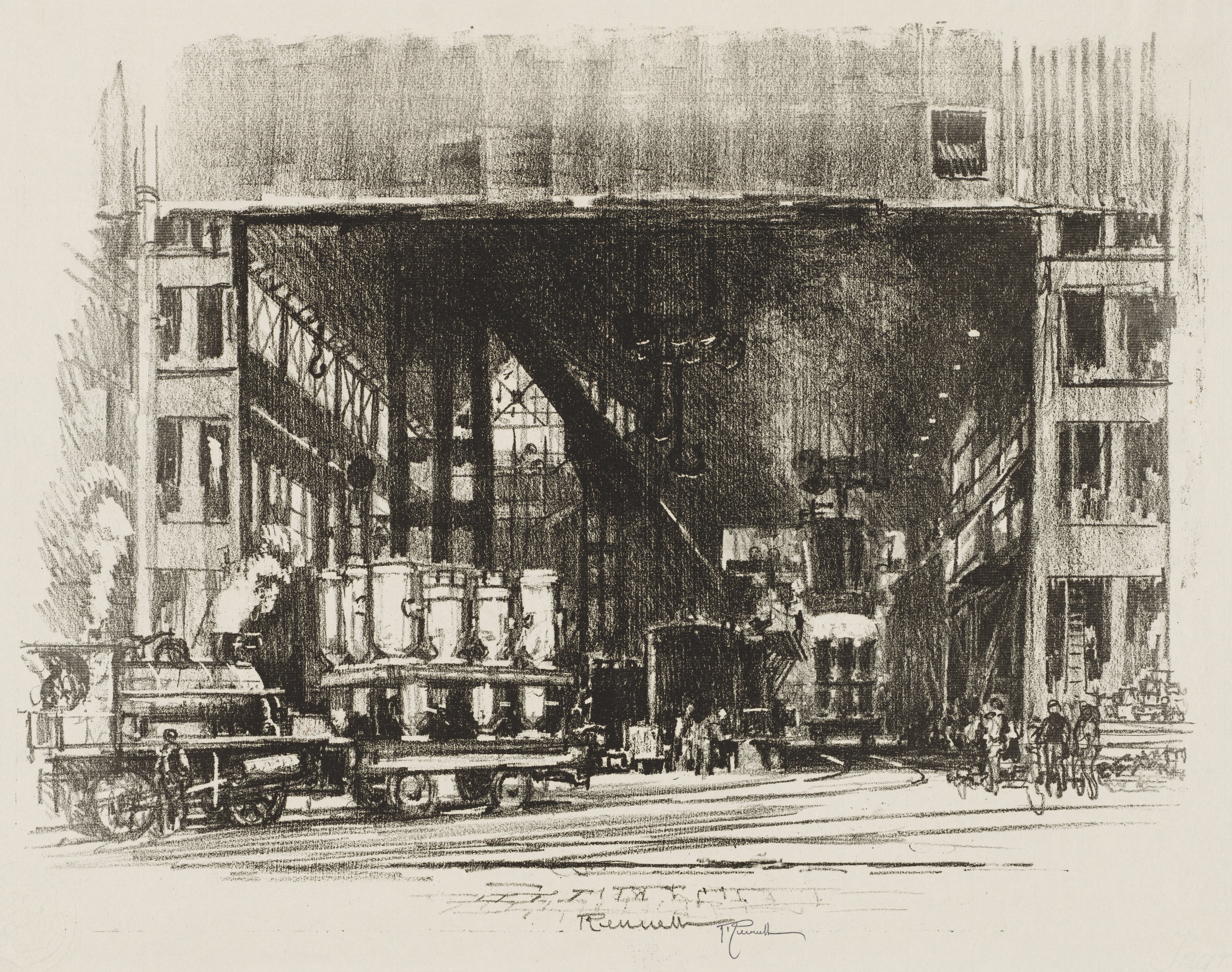 Black and white image of a large industrial interior with large metal urn-like objects on a rail cart; people and carts on right. The image depicts a large industrial interior with a high ceiling. There are large urn-like objects on a rail cart on the left side. The objects are on a flatbed rail cart with a steam engine on the left. There are people and carts on the right side. The background shows large structural supports and beams. There are tall buildings on either side. The image has a rough texture with shading and lines typical of a sketch or drawing. The artist's name appears at the bottom center.