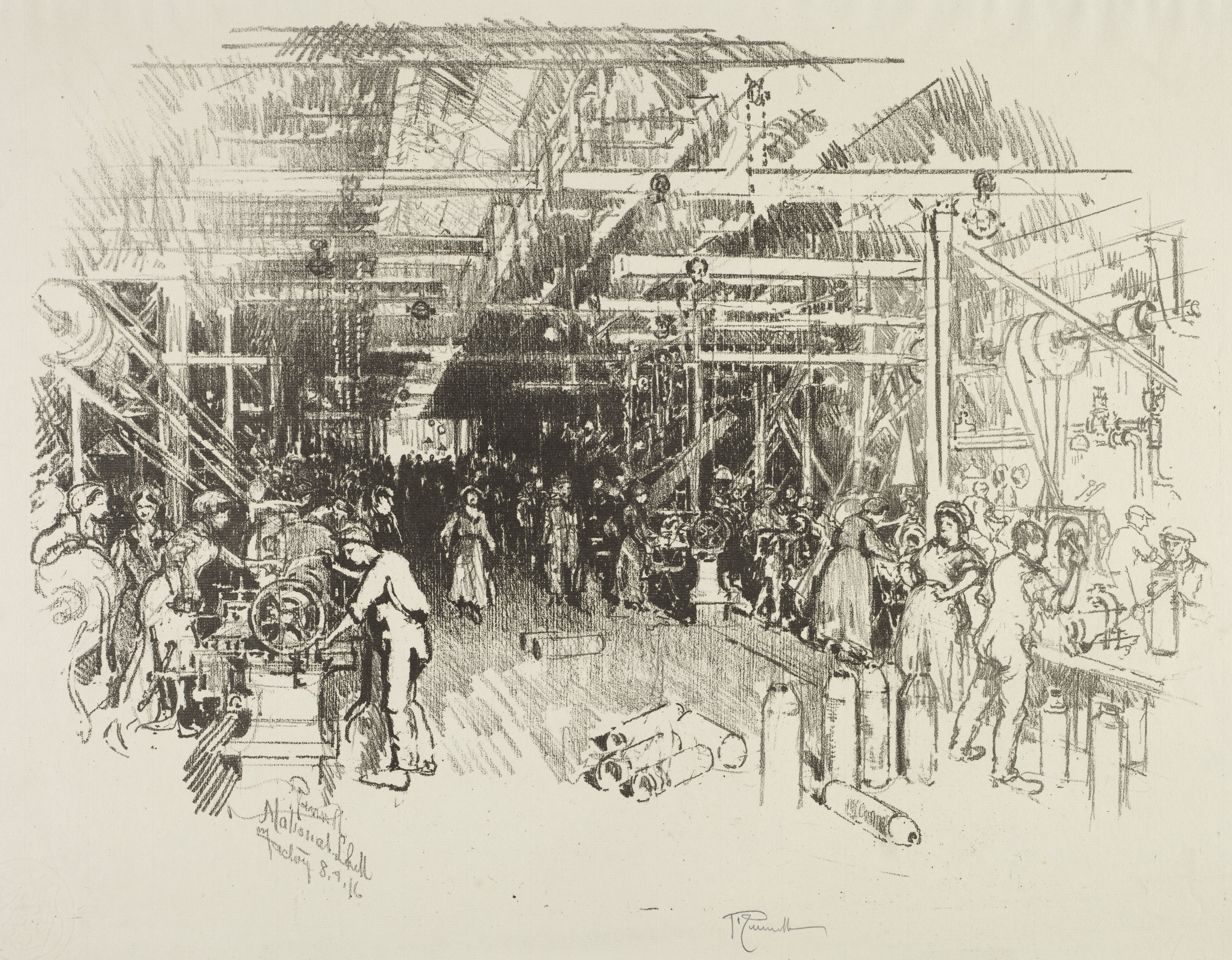 The image depicts a black and white sketch of a factory interior. A large room with an exposed ceiling and metal beams is filled with people working at various stations. On the left, a man in a white shirt and dark pants leans over a machine. Nearby, a woman in a dress and hat stands beside another machine. On the right, a woman in a dress and hat talks to a man in a uniform. A long table runs along the right side, with a man standing beside it. Various cylindrical objects lie on the floor in the center. The background shows more workers and machinery. The artist's signature appears at the bottom.