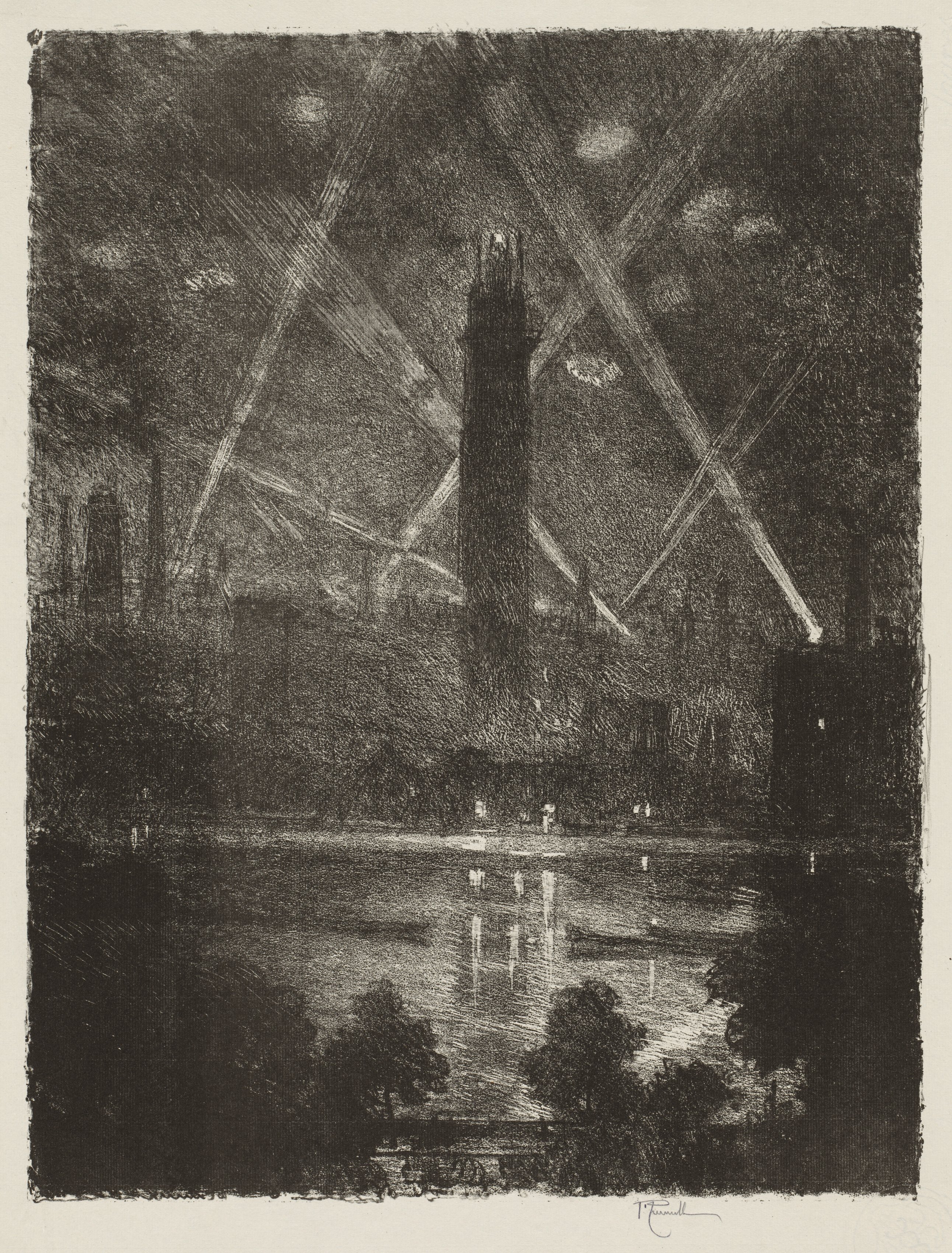 The image depicts a nighttime scene with a body of water in the foreground and a cityscape in the background. The body of water reflects light from the city. In the background, there are several buildings, one of which is tall and slender, possibly a tower. The sky is dark with several bright lights crisscrossing it, resembling searchlights. The overall atmosphere suggests a city under attack or on high alert, possibly during wartime. The image is rendered in dark tones, with heavy shading and texture, giving it a dramatic and ominous feel. The artwork is by Joseph Pennell and titled "English War Work".