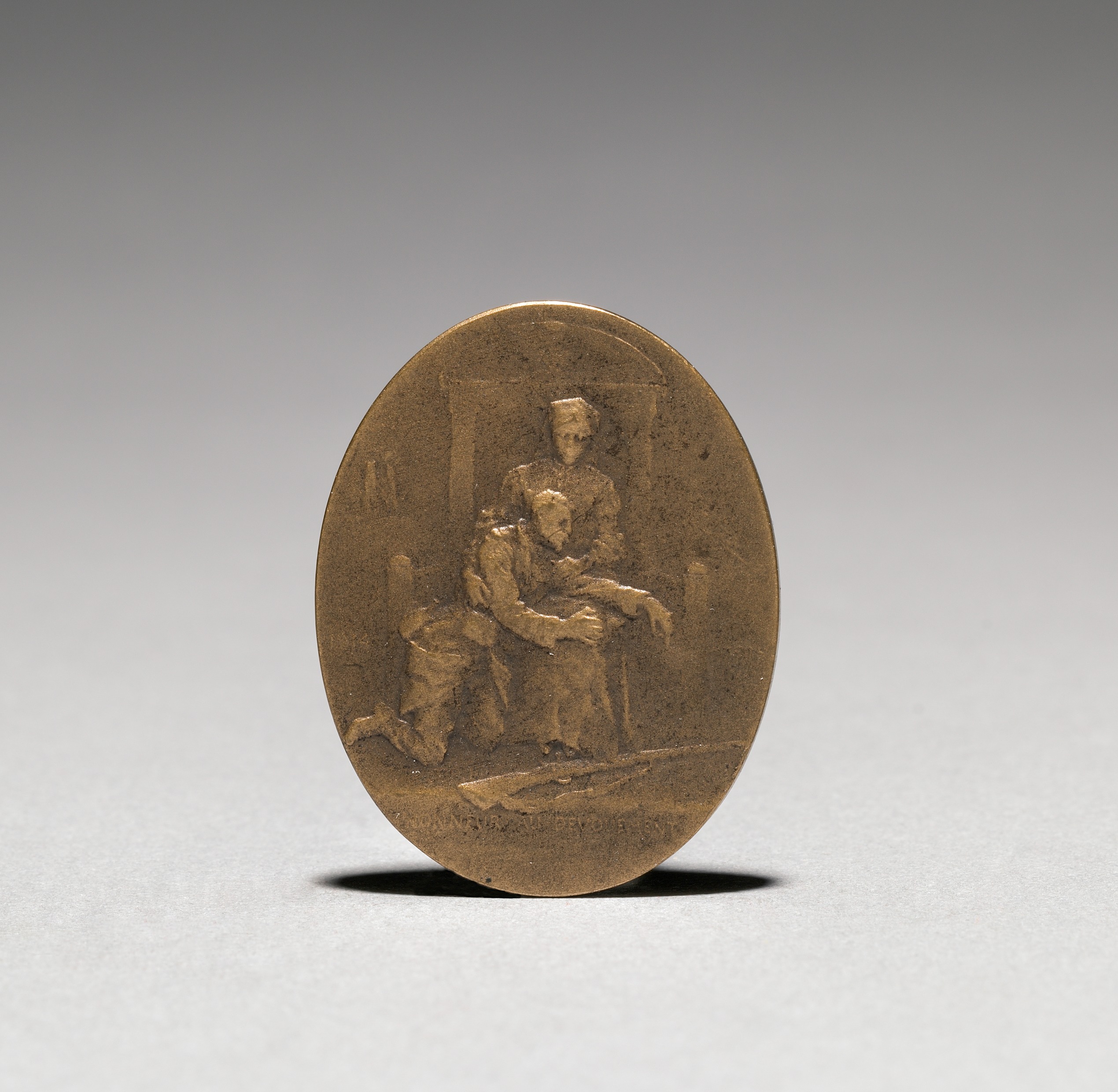 Medallion with a raised image of a woman sitting on a chair and holding another person on her lap. The woman wears a head covering and a long dress. The seated figure leans on the woman while wearing a robe. At the bottom edge is raised text too small to read. The medallion is bronze and fairly circular with a weathered exterior. The background fades from dark to light gray. Medallion (obverse) by Jean Paul Aube.