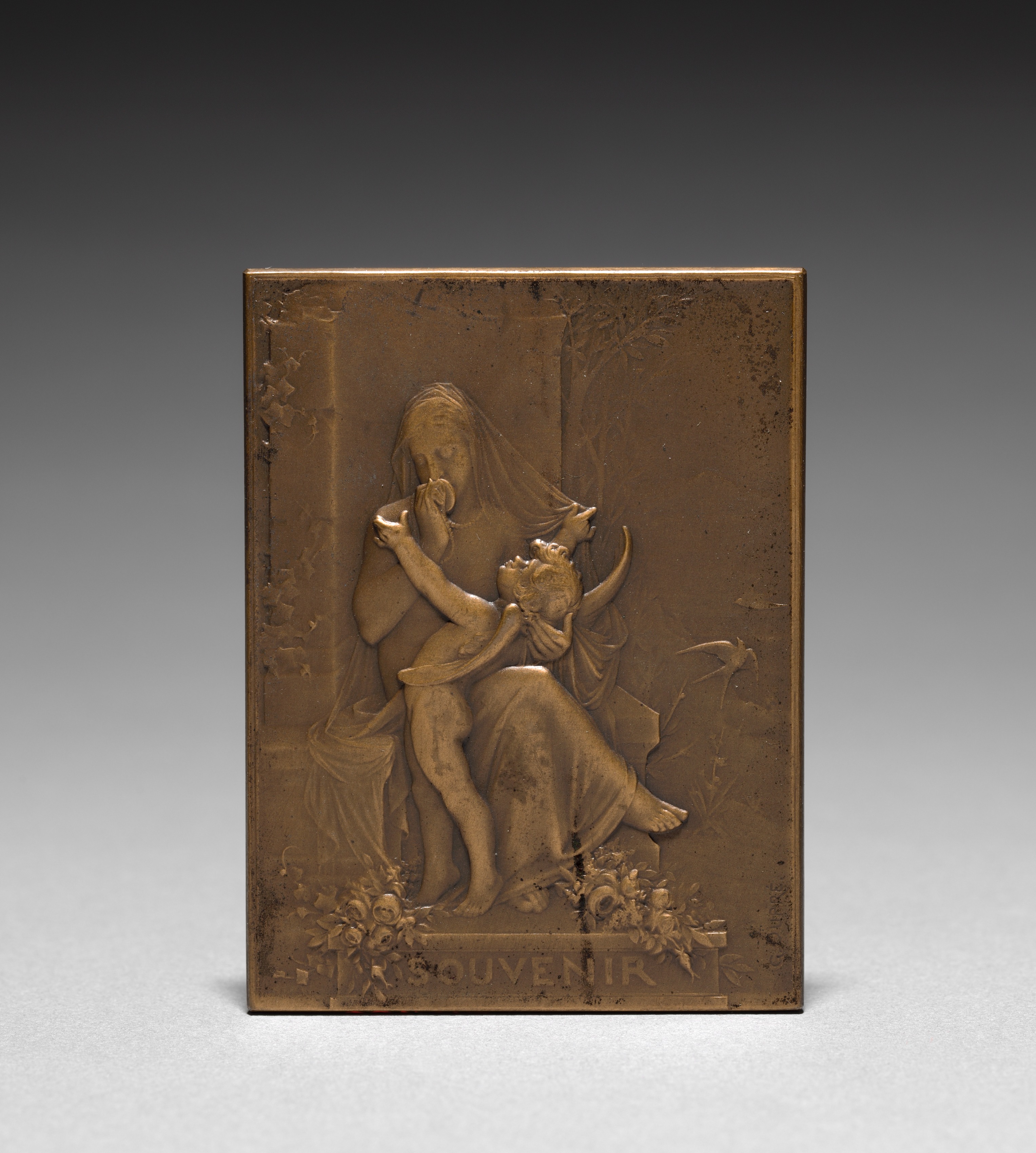 Medallion with a raised relief image of a woman and a child. The medallion is rectangular and made of bronze or brass. The woman sits on the left, wearing a long dress. Her right hand holds the child's left hand. The woman's left hand holds a flower or fruit up to the child's face. The child sits on the right, wearing a long dress. The child's right hand holds a curved object. The background of the medallion has a tree on either side, flowers at the bottom and a bird on the right. The word SOUVENIR is stamped along the bottom edge. The medallion shows signs of aging with dark spots and wear along the edges. The background behind the medallion fades from dark at the top to light at the bottom. Medallion by Jules Dupré.