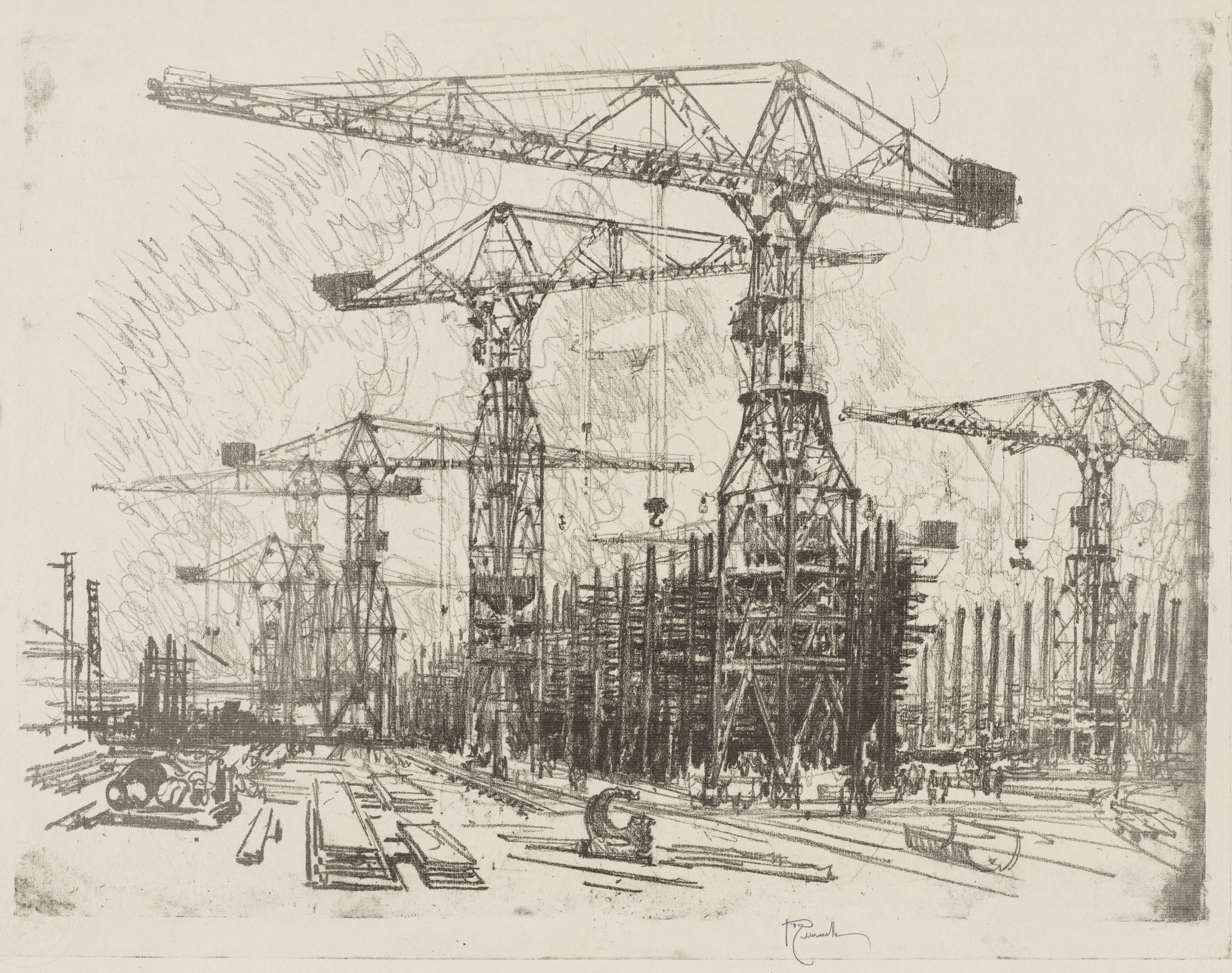 The image depicts a black and white sketch of an industrial scene. The scene shows a shipyard with large cranes. The cranes have long booms and are supported by tall metal towers. There are multiple cranes in the image, with one prominent crane in the center. The cranes appear to be in various states of use. The background shows a light-colored sky. There are scribbled lines throughout the image. The foreground shows various industrial equipment and supplies. The image is signed by the artist in the bottom center. The overall atmosphere suggests a busy industrial setting. The image is titled "English War Work: The Old Shipyard" and is by Joseph Pennell.