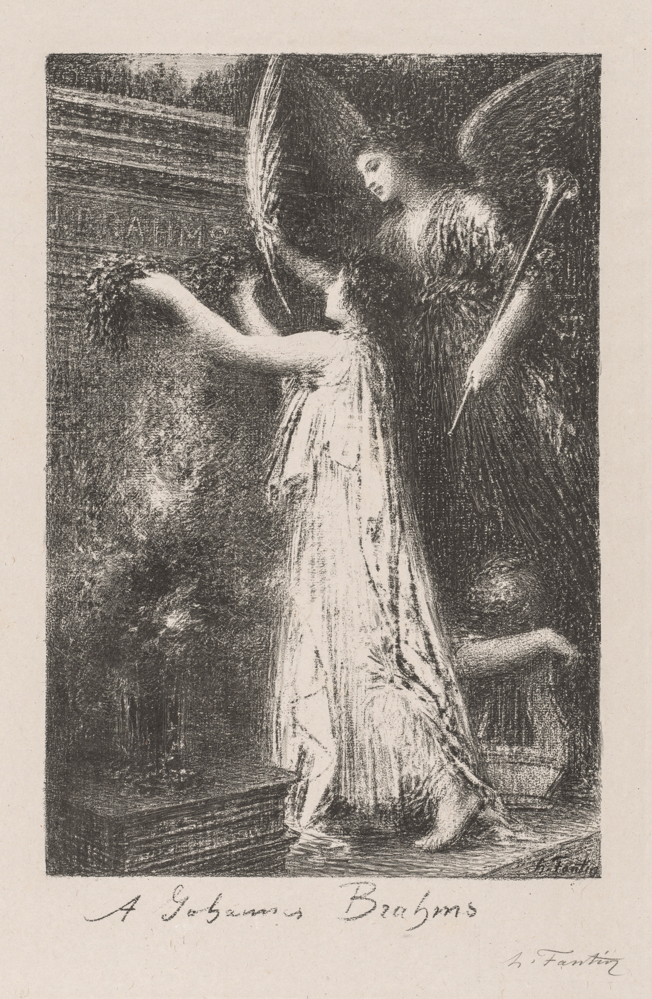 Black and white drawing of a woman and an angel. The woman stands on the left wearing a long dress. She reaches out her right arm to touch an engraving on a stone wall. The engraving reads "Brahms". The angel beside her on the right wears a long dress and has wings and a horn. The woman's left arm is behind the angel. The background contains a vase on a table and an urn on a pedestal. The text at the bottom reads "A Johannes Brahms".