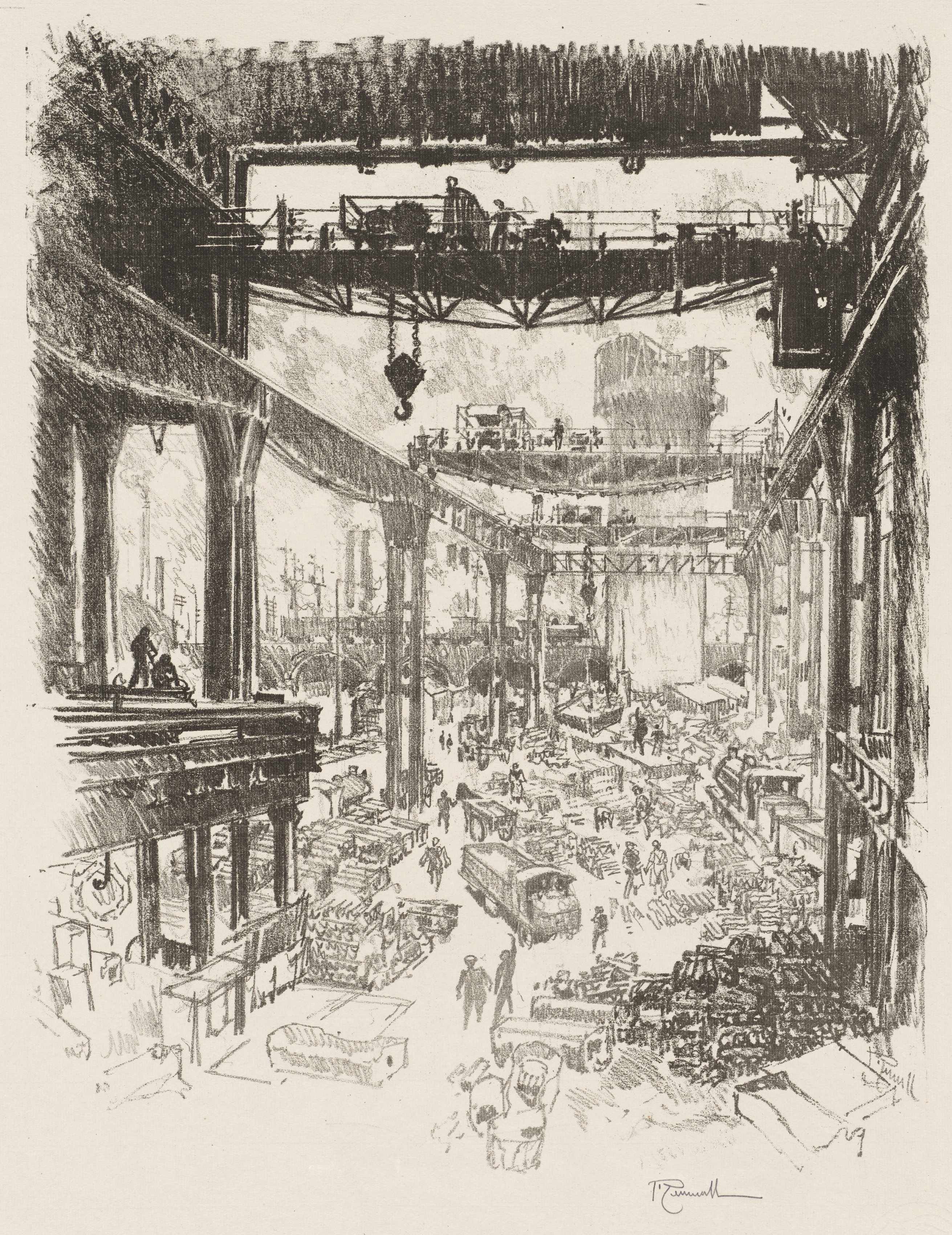 Black and white drawing of an industrial interior scene. A large room with high ceilings and many industrial machines and supports. There are workers throughout. In the center, there is a large pile of pig iron, which is a type of crude iron. There are also several large metal structures, including a crane. People are standing on walkways and on the ground. The background shows more industrial equipment and buildings. The artist's signature is visible at the bottom.
