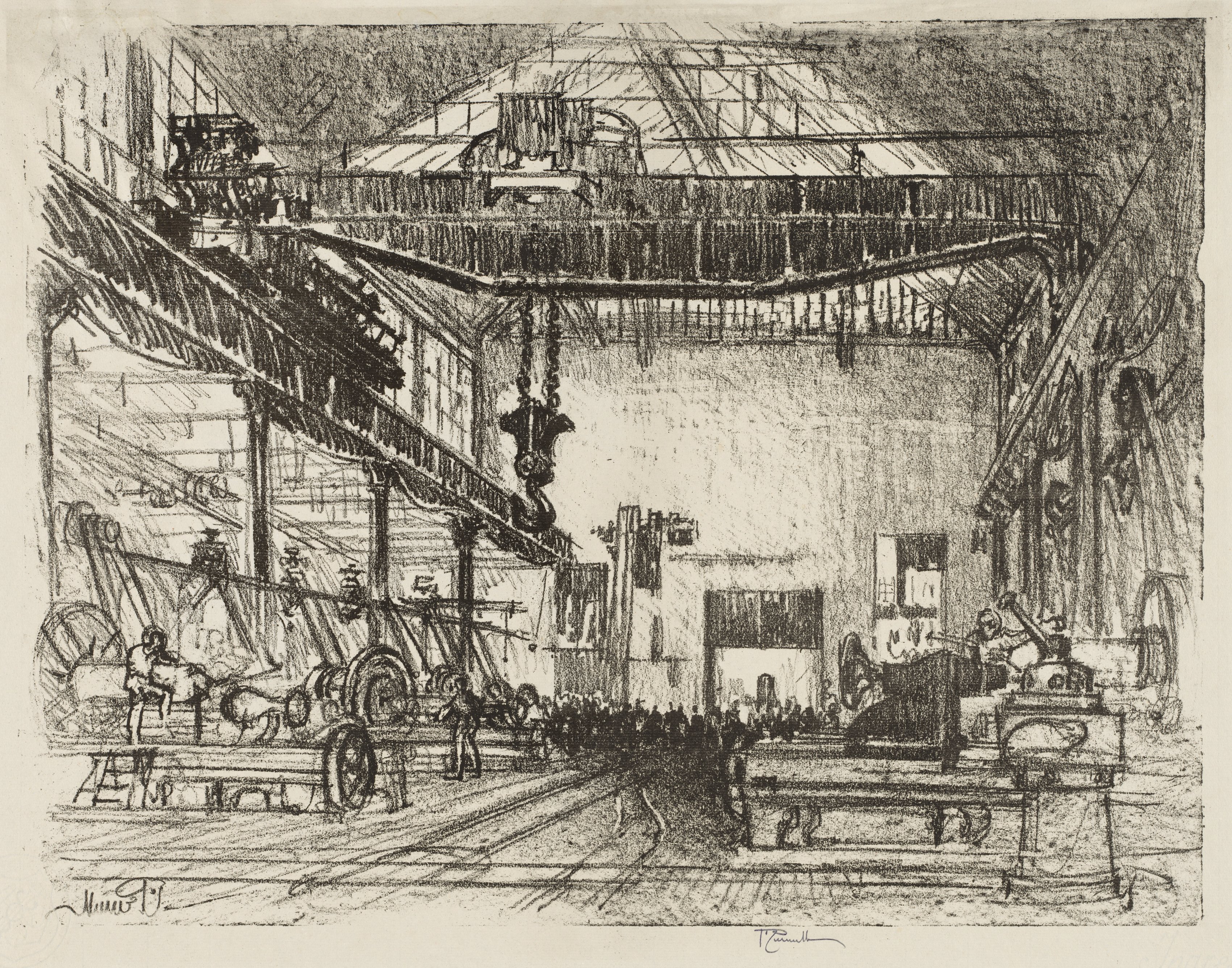 Black and white sketch of an industrial scene. Large room with high ceiling. People standing on the floor. Large machinery. A crane hanging from the ceiling. Two large cannons on either side. People working. Industrial work being done. Dark shading contrast with some light areas.