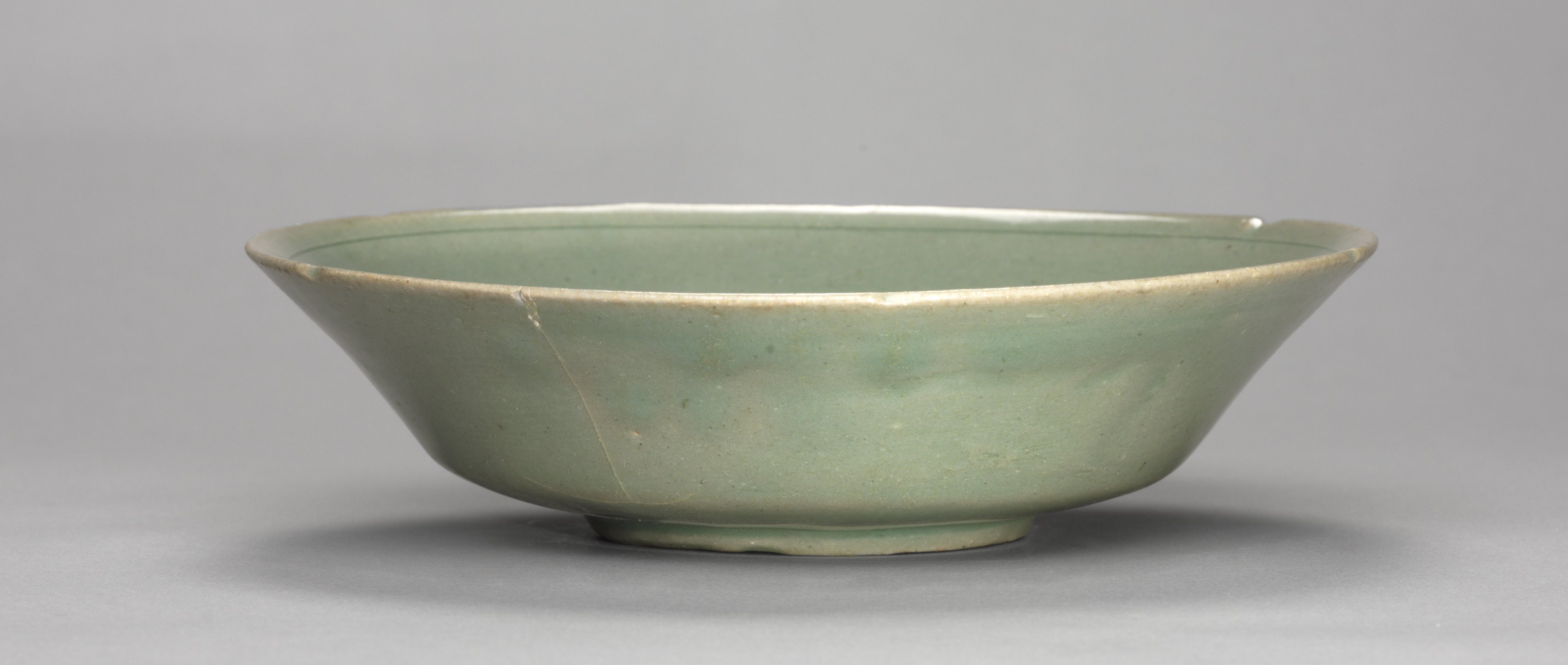 Dish, ceramic bowl with light green glaze, wide and shallow shape, rounded body, short foot, chipped edges, light gray background.