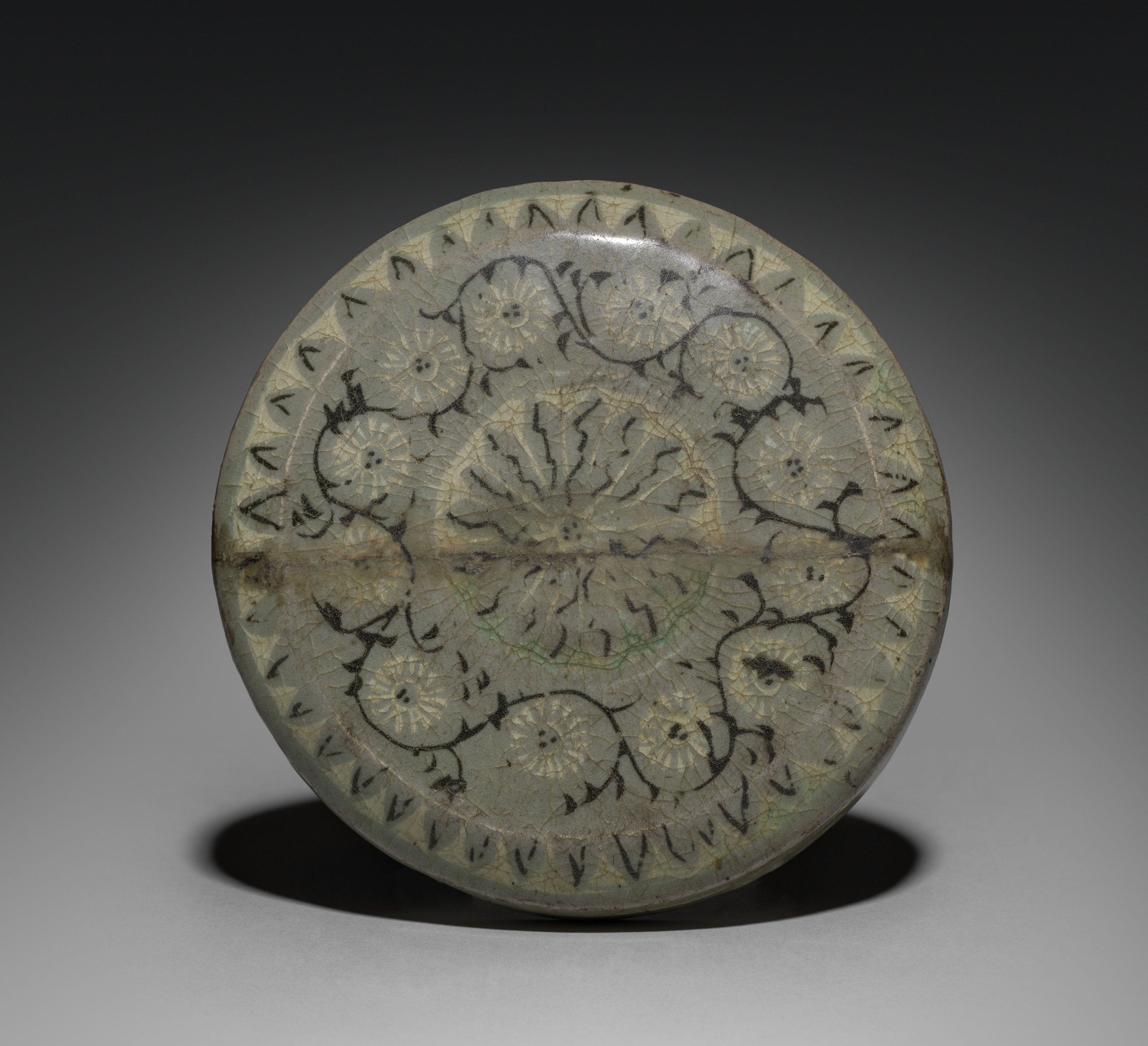 Ceramic box lid with a cracked, greenish-gray glaze. The lid is round and flat. A floral design in black and beige is painted on the lid. The design consists of a central flower surrounded by eight smaller flowers. A zigzag pattern borders the edge. The background is a gradient from dark gray to light gray. A shadow is cast beneath the lid. Title: Box (lid). Artist: Unknown.