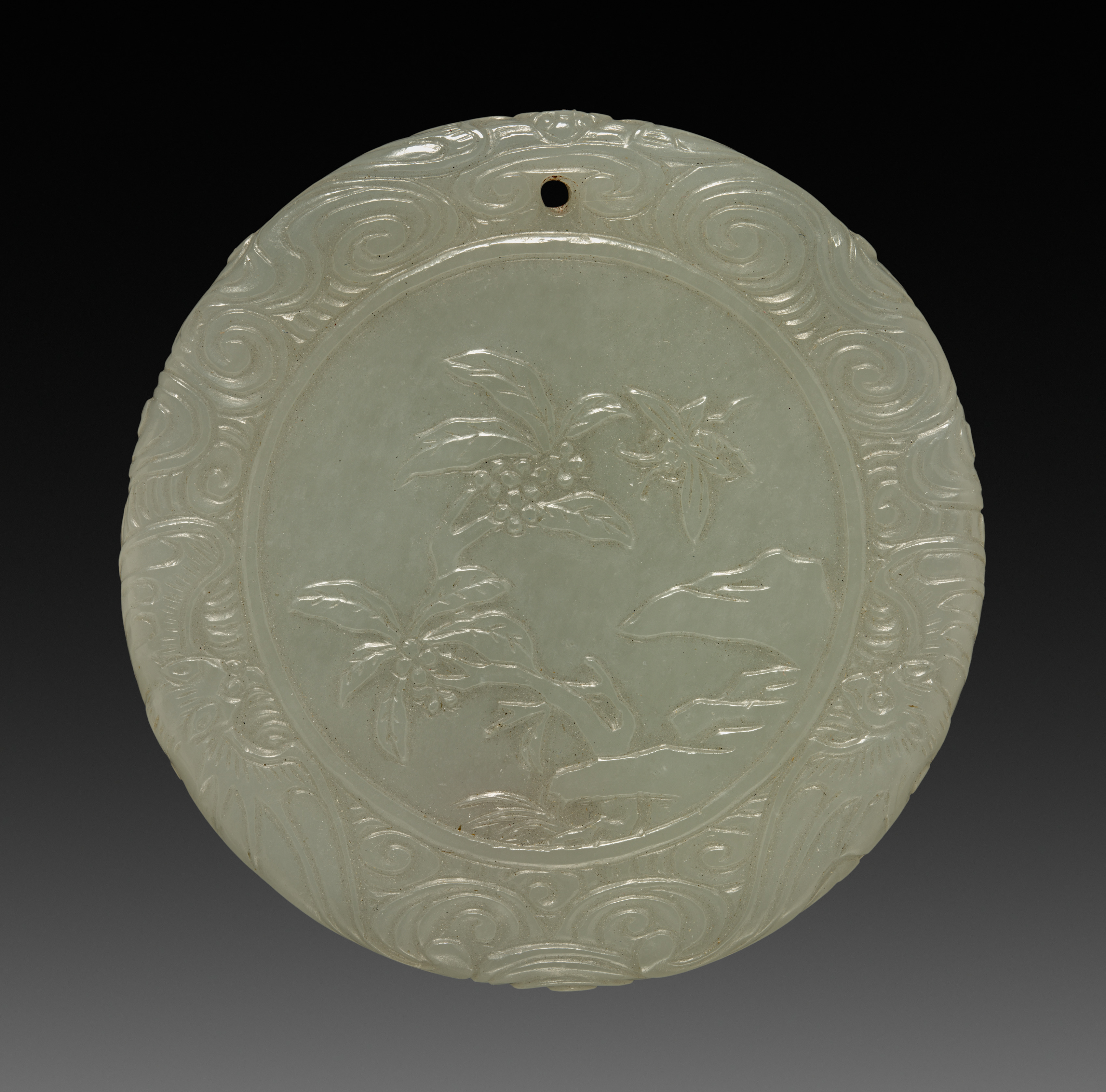 Circular pendant made of pale green jade, featuring a carved design of a tree with leaves and berries within a circular border. The border is decorated with scrolling patterns and curled motifs. A small hole is at the top for suspension. The pendant has a glossy finish. Title: Circular Pendant. Artist not specified.