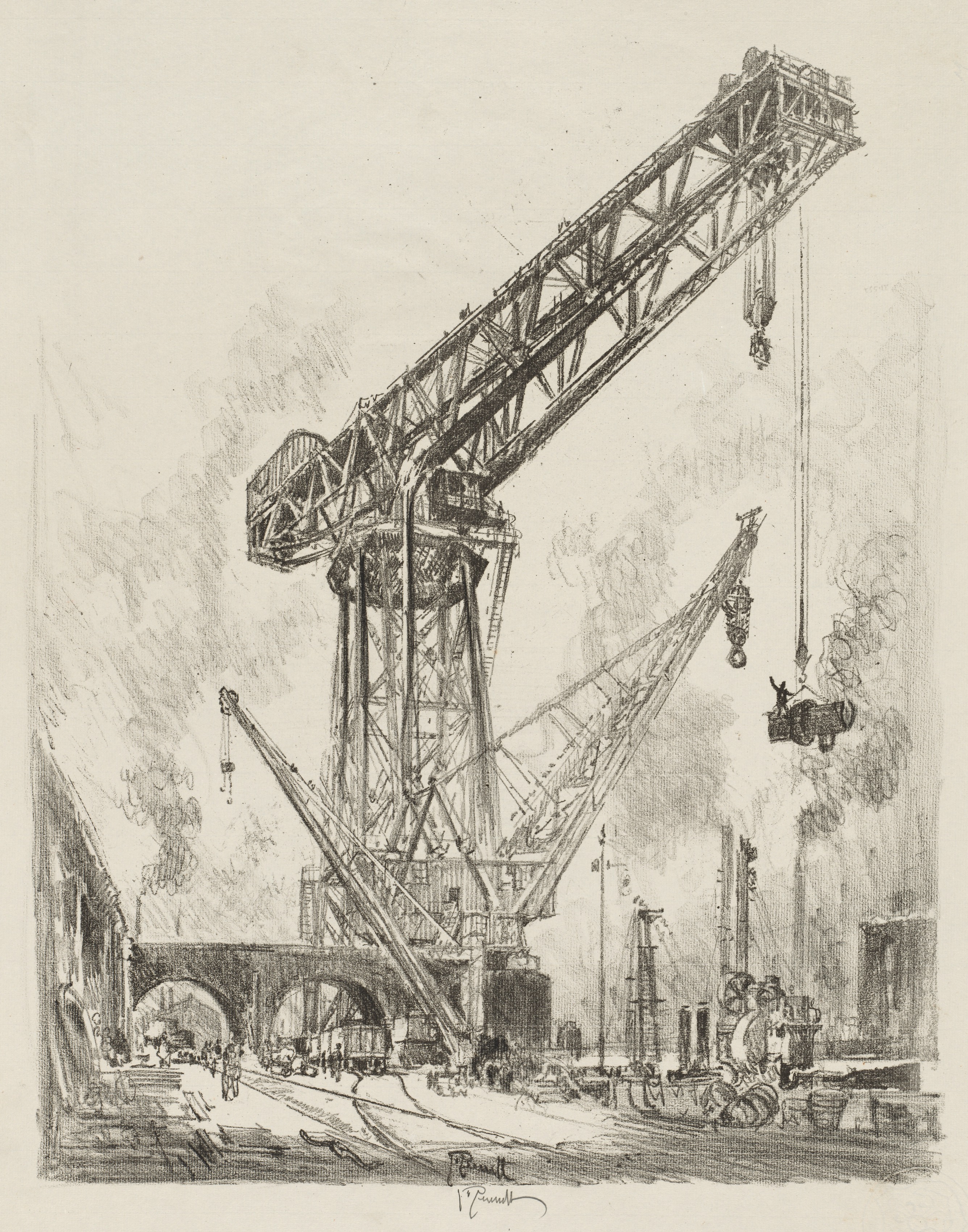 Black and white drawing of a large construction crane. The crane is in the center and drawn in great detail with shading throughout. It sits on a small platform beside a body of water. A block of concrete is hanging from the end of its arm. In the background on the left is another construction site and a bridge. On the right in the background are a few buildings with smoke billowing from their roofs. In the foreground on the right is a steam locomotive. The background sky consists of shading and smudges. The artist's signature is on the bottom.
