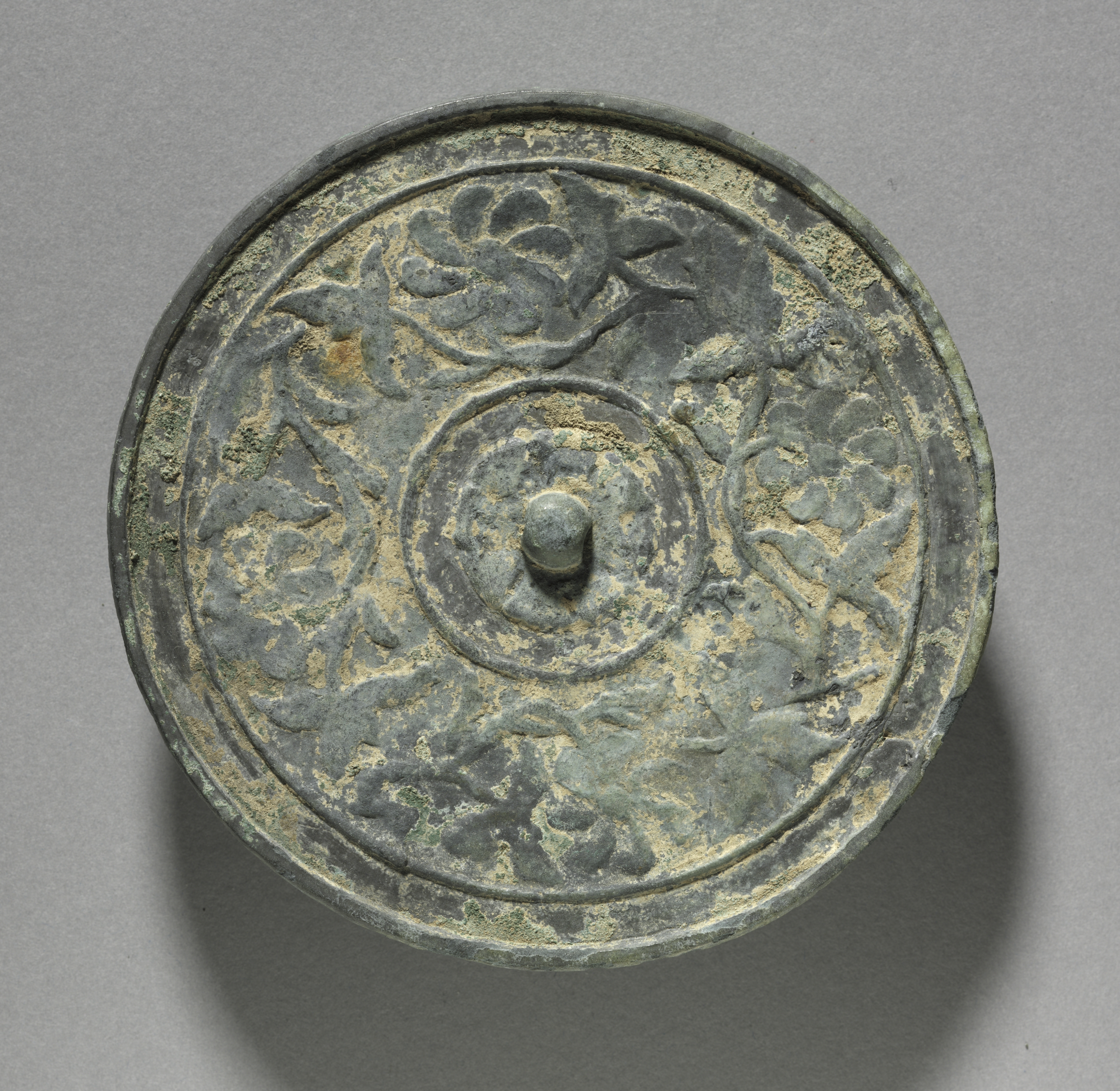 The Mirror with Scroll Design is a circular, bronze object with a raised edge. The surface is predominantly gray with patches of green and yellow patina. A central circle features a small knob. A double-lined circle encircles the knob. The outer area contains raised scroll designs with leaves and flowers. The background of the image is grey with the object's shadow visible below it.