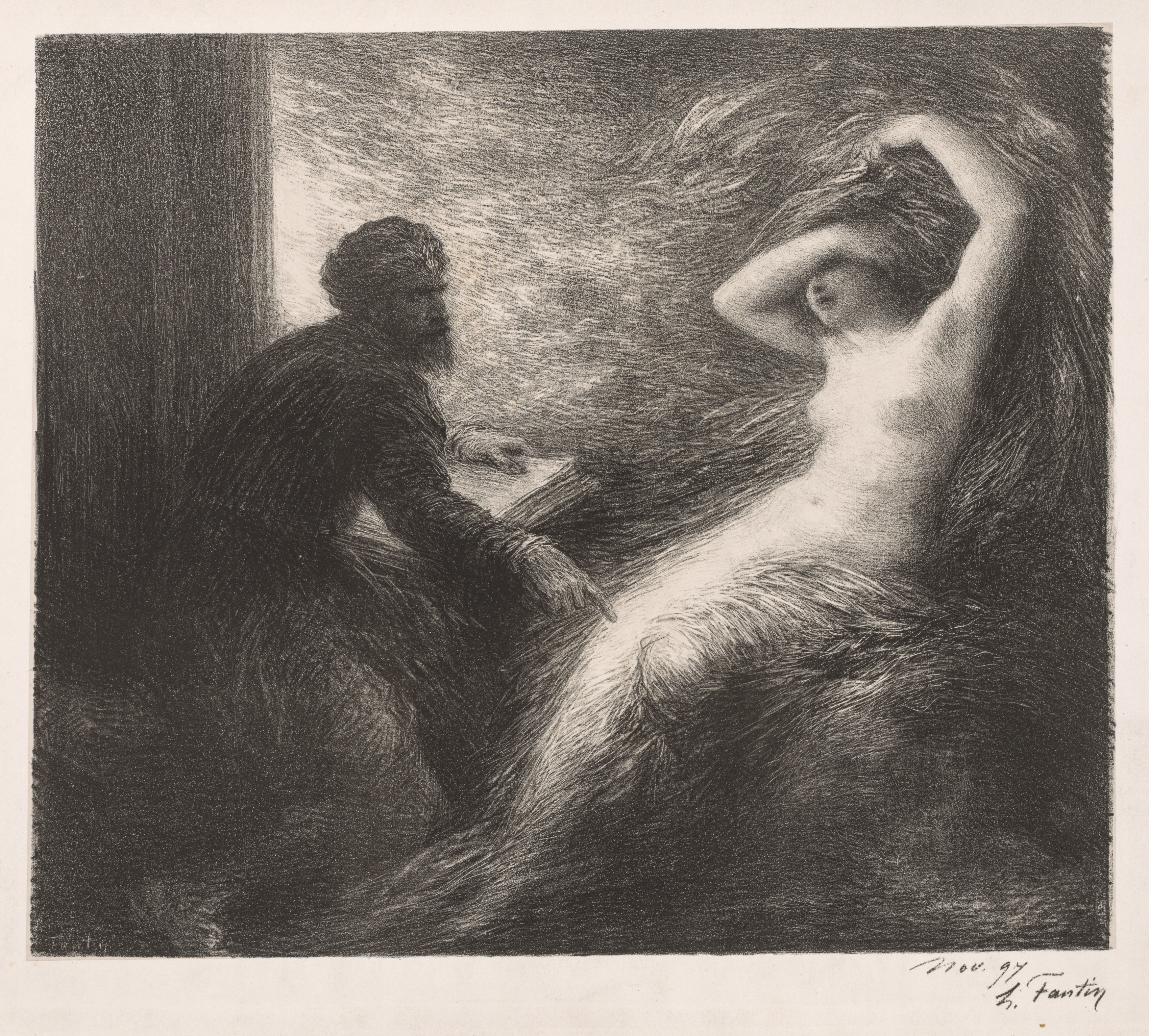 Black and white drawing of a man sitting and a half naked woman standing. The woman's back is to the viewer, she has her arms raised. The man sits at a table on the left. The drawing is signed. The scene is indoors by a window. The image is in a rectangular format.