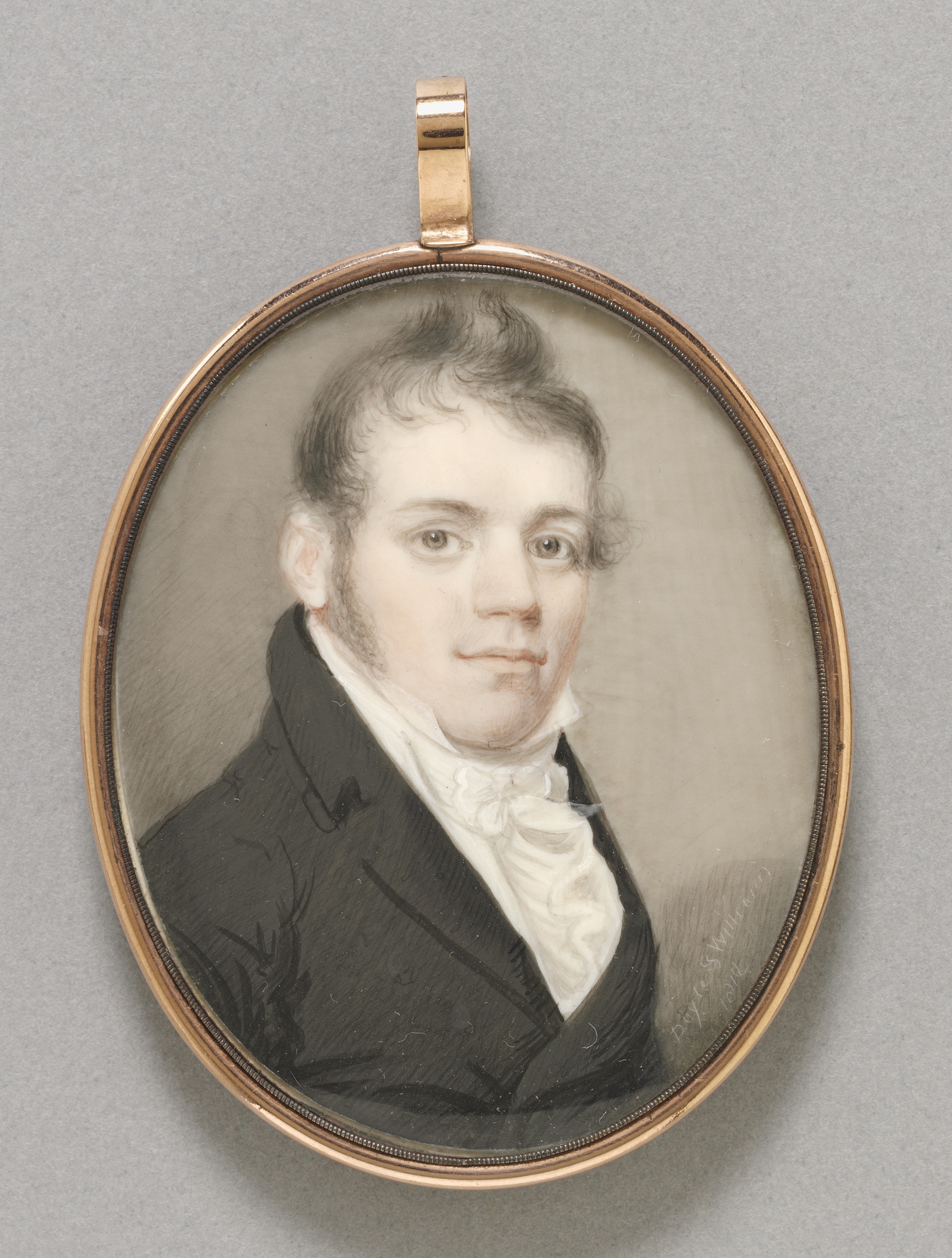 Oval-shaped portrait of a man with short, curled brown hair, wearing a black jacket and a white shirt with a high collar; framed in a gold pendant frame. The man has light-colored eyes and light skin; he is centered in the frame looking directly ahead with a slight neutral expression. The background is plain and light-colored. The frame has a decorative edge. The pendant has a gold loop at the top. The painting's style and frame are typical of a 19th-century miniature portrait. The subject is John Clark, created by artist William Doyle.