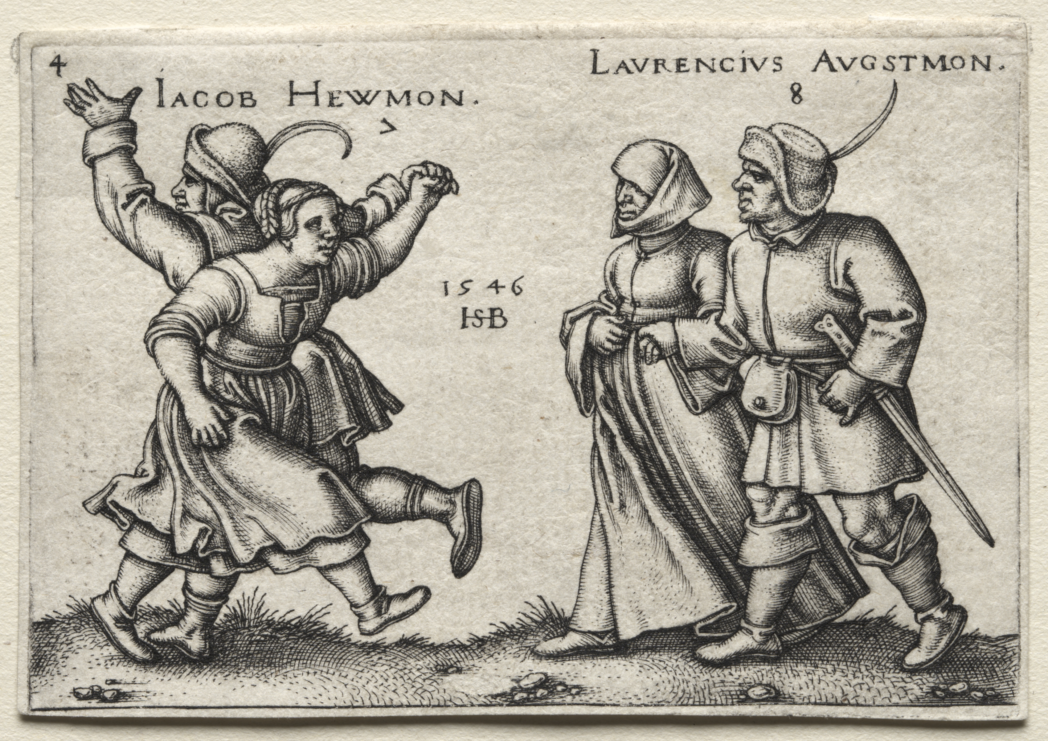 Black and white image. Two men and one woman. Man on left wearing hat with feather and cloth dress. Man on left has one leg lifted and both arms raised. Second man from left wearing cloth dress. Man on right wearing hat with horns and holding sword. All wear boots. Text at top reads "Jacob Hewmon" and "Lavrevius Augstmon". Small text in center reads "1546 HSB".