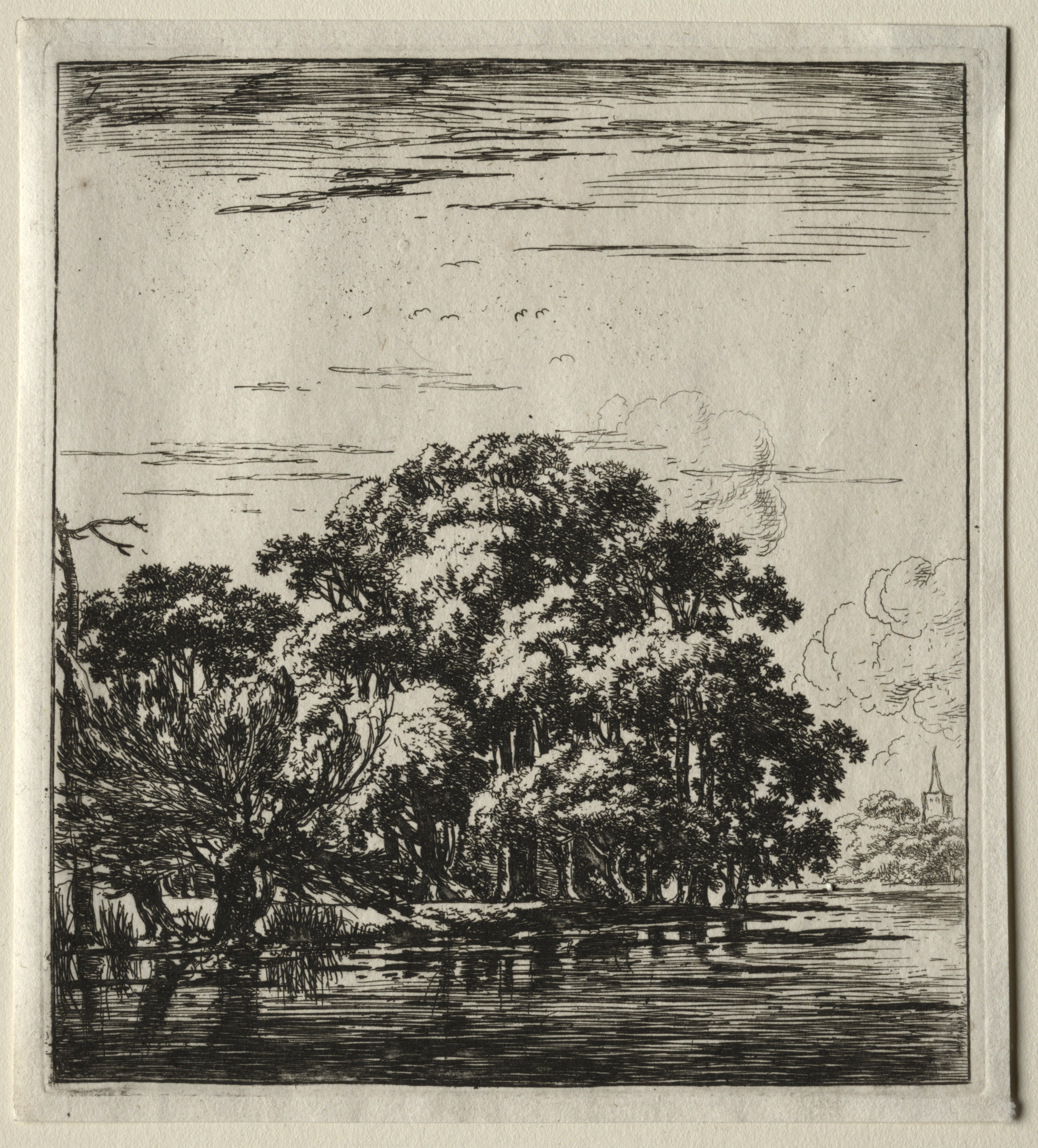 Le bois au bord de la rivière by Herman Naiwincx: A black and white drawing of a wooded riverbank. The image shows a group of trees on the bank of a river. The trees are dense and leafy, with some bare branches on the left. The riverbank is low and flat. The sky above has some clouds and birds flying. In the background on the right, there is a church steeple. The drawing is framed by a thin border. The image is rendered in dark lines on light paper. The overall scene is serene and natural.
