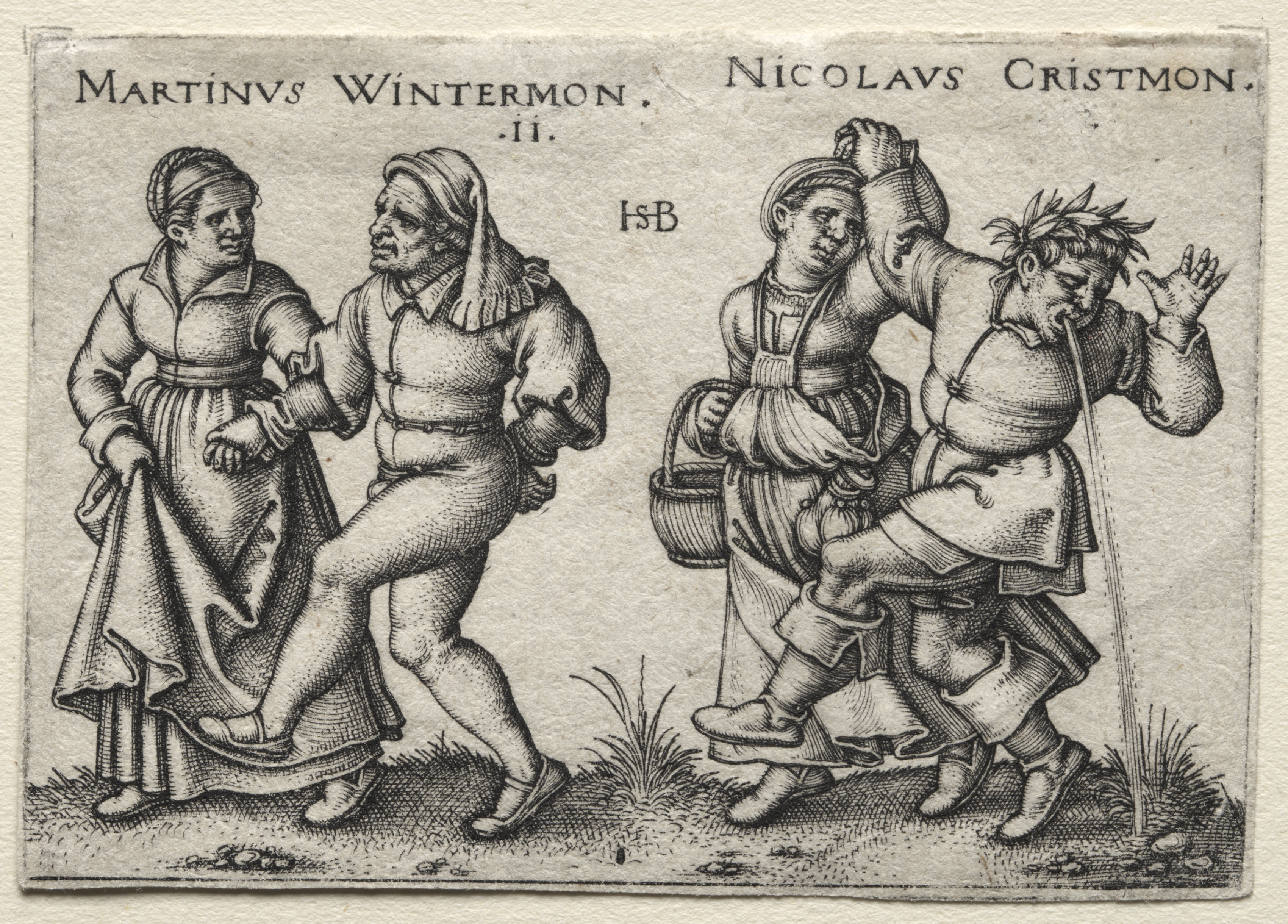 Black and white engraving of four people. Two people on the left; one man, one woman. The man on the left wearing a long head covering and dress, the man on the right with a cap. Two people on the right; a man wearing a hat. man carries another on his back. The man on his back has leaves on his head, blows a pipe, and holds up his right hand. The engraving has text at top; on left: "MARTINV WINTERMON . II." and on right: "NICOLAVS CRISTMON." A monogram "HsB" is centered. The figures are on a grassy ground. They wear 16th century clothing.