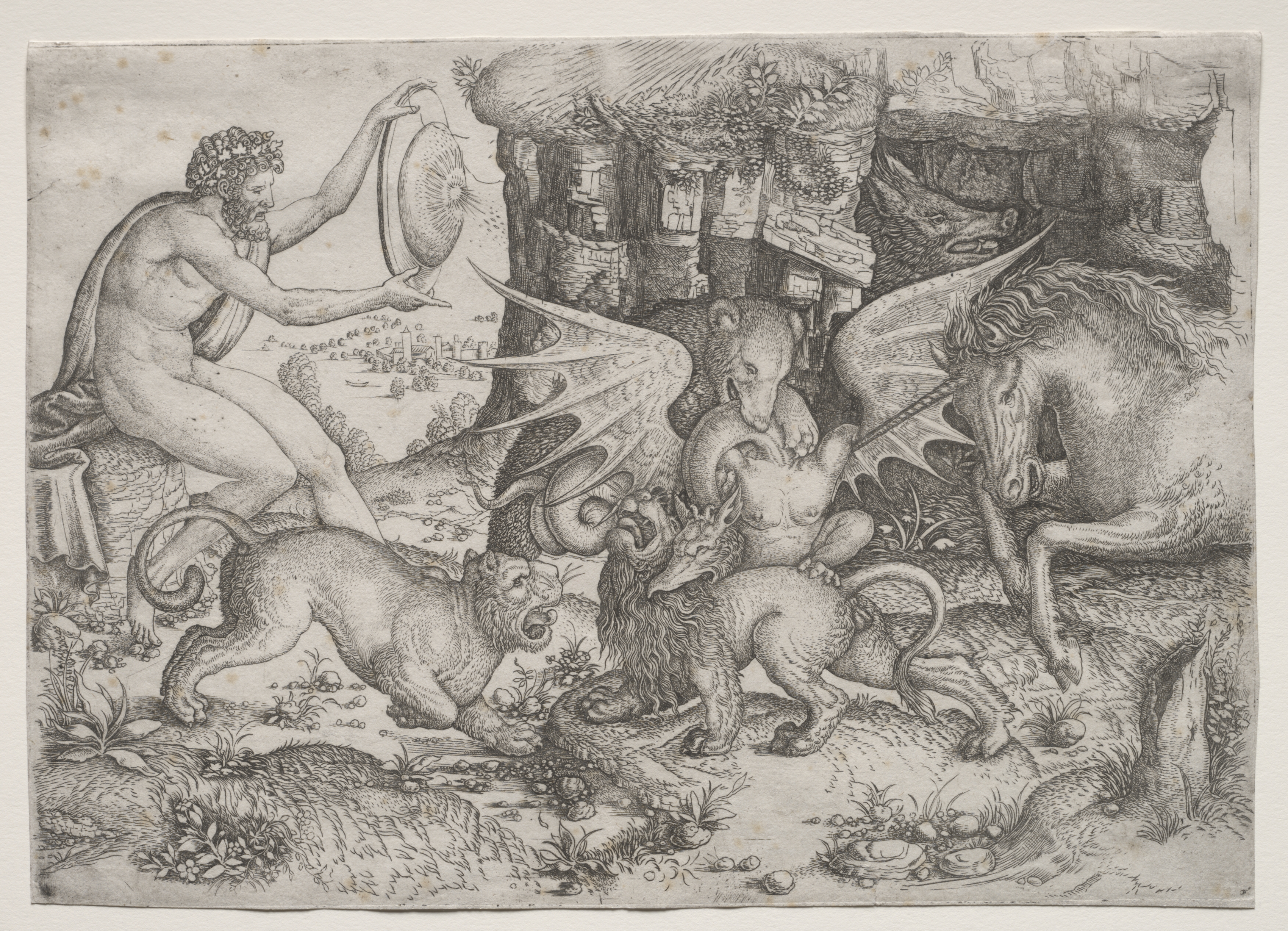 Master of the Beheading of St. John the Baptist's Combat of Animals, a black-and-white drawing depicting a chaotic scene of animals and human figures. The scene contains a nude male figure on the left with curly hair and a beard holding a shield and a sword while looking to the right; he's seated on a rock. To his right are two nude figures. One standing on all fours and another on two legs with large ears. The foreground features several animals: a bear on the left, a boar-like creature below the central figure, and a lion-like creature facing the right. On the right side, a creature with a dragon-like body and a horse or donkey-like head lunges to the left. The background includes a rocky cliff with openings, possibly a cave, and a distant city or buildings on the left. The scene is set amidst foliage and rocks with a variety of plants throughout.