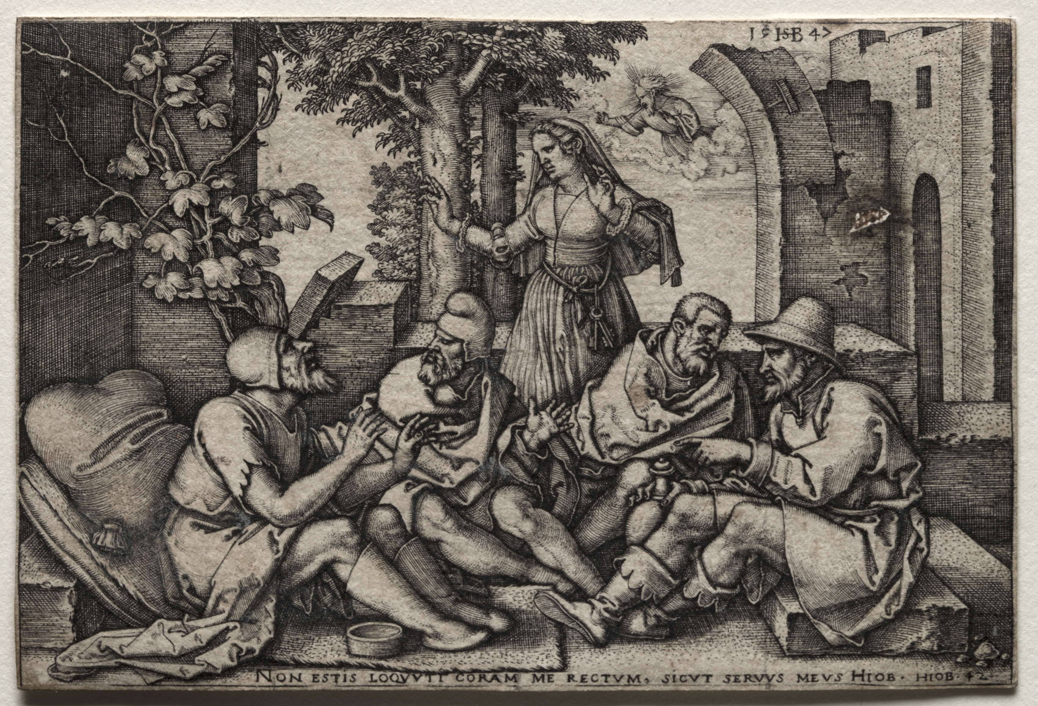The engraving depicts a group of five people outdoors. A woman stands in the center of the group. She wears a long dress, a veil on her head, and her right hand is raised near her face. Four men sit around her. The man on the left sits on a pile of fabric with his right leg crossed over his left. He gestures with his right hand towards the center of the group. The man to his right sits cross-legged. He gestures towards the woman with his right hand. The next man sits with his legs stretched out. He leans slightly towards the man on his right and gestures towards him. The man on the far right sits with his legs tucked under him and wears a hat. In the background, there are trees, a stone wall with an archway, and a figure in the sky surrounded by rays. A tree trunk and branches with leaves are to the left of the group. A line of text runs along the bottom of the engraving. The engraving is titled "Job and His Friends" by Hans Sebald Beham.