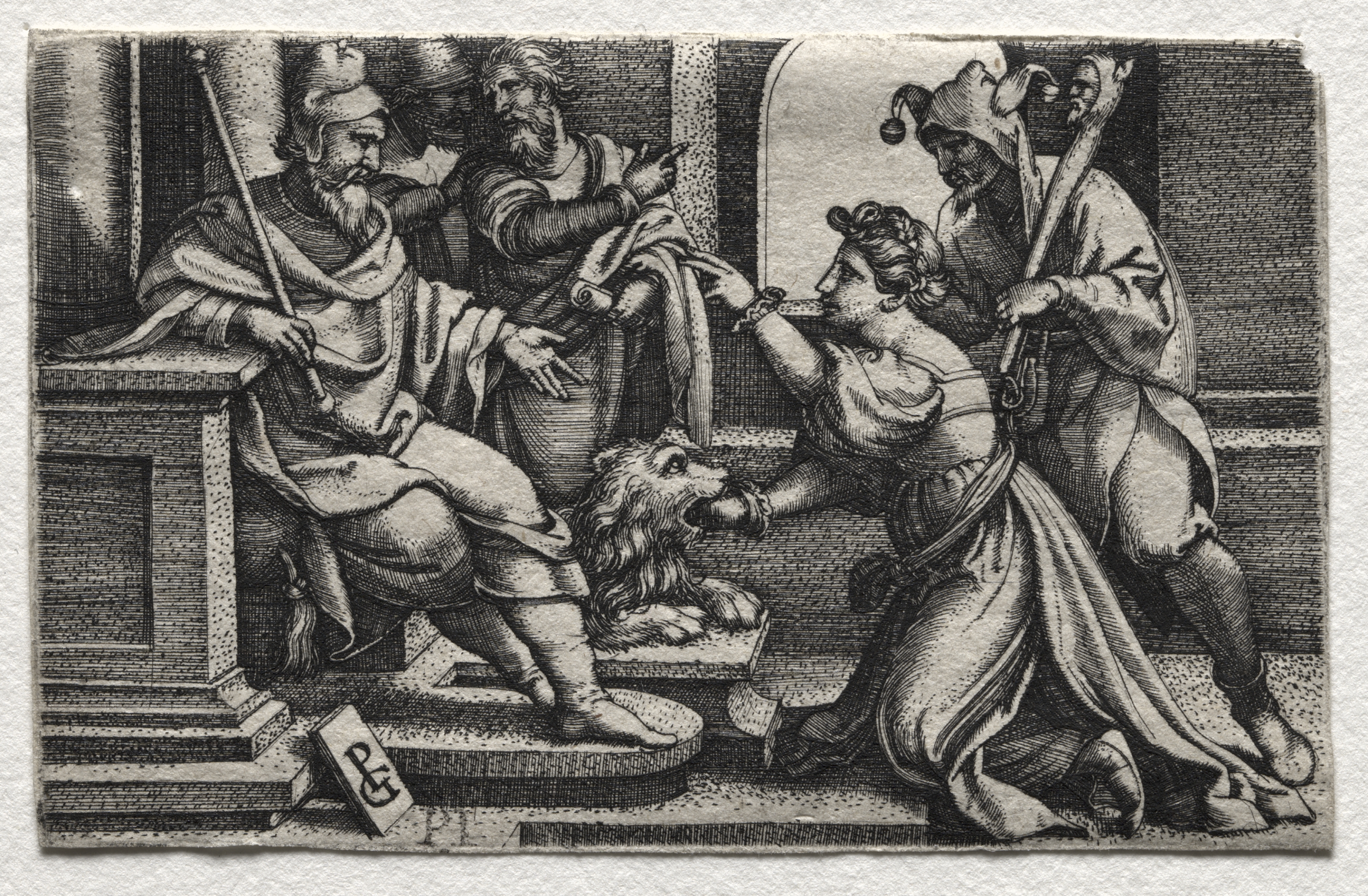 Black and white engraving depicting a scene with five people and a lion's head. The man on the left sits on a stone bench or throne. He is bearded, wears a hat and a robe. He holds a staff in his right hand. The woman on the right has one knee on the ground. She wears a long dress. The woman holds the lion's mouth open with her right hand. There are two men behind the seated man and one man beside the woman. The background has stone steps and an archway. "The Mouth of Truth" by Georg Pencz.