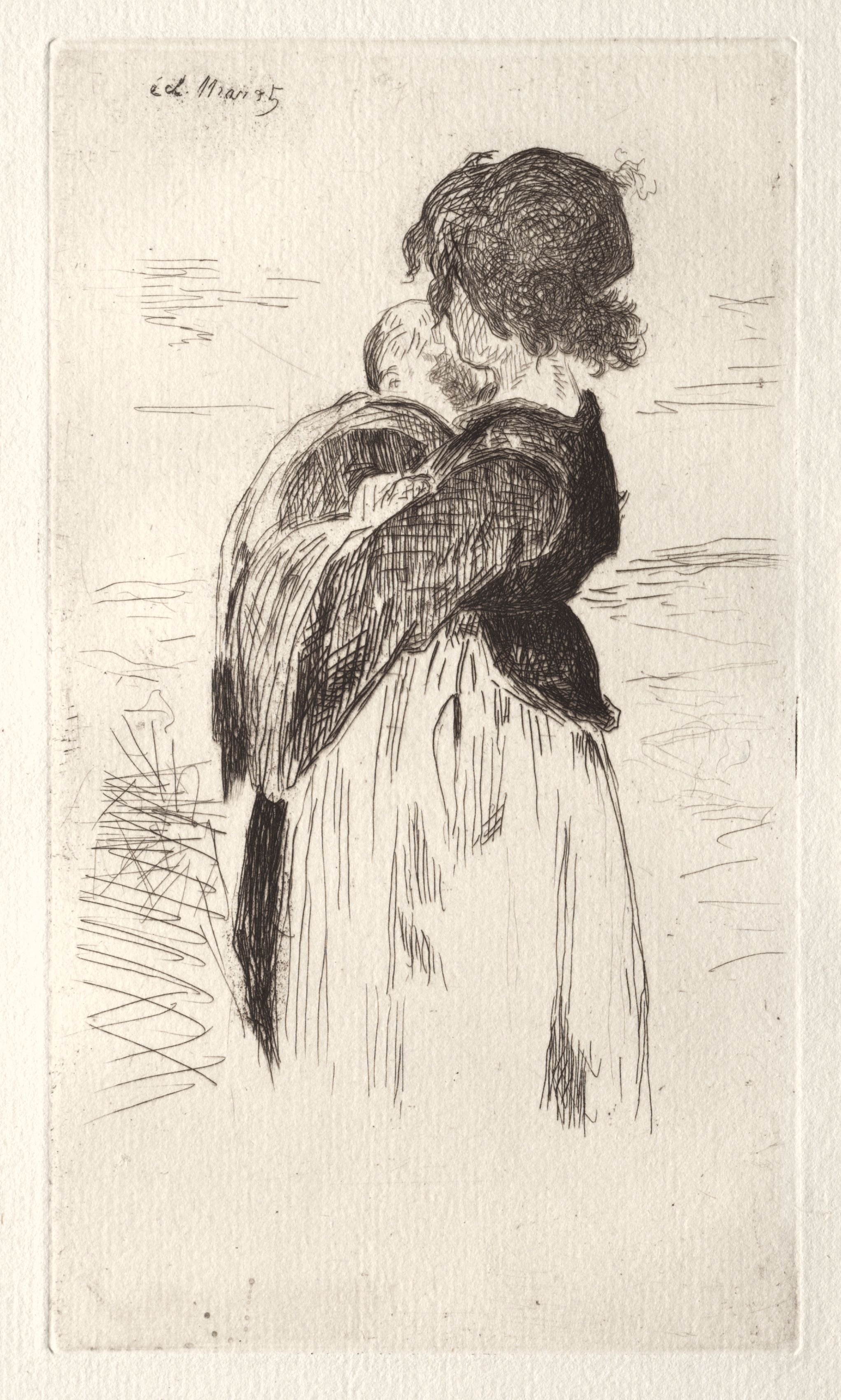The image depicts a black and white sketch of a woman holding a baby, titled "La petite fille tenant un bébé" by Edouard Manet. The woman wears a long dress and a shawl; her dark hair is styled in a bun. She faces right, looking down at the baby in her arms. The baby's head rests on the woman's right shoulder. The sketch is done in a loose, expressive style with visible lines and shading on off-white paper. The background is minimal. The woman's clothing appears detailed, with folds and textures suggested by the lines. The overall composition is intimate, focusing on the woman and child.
