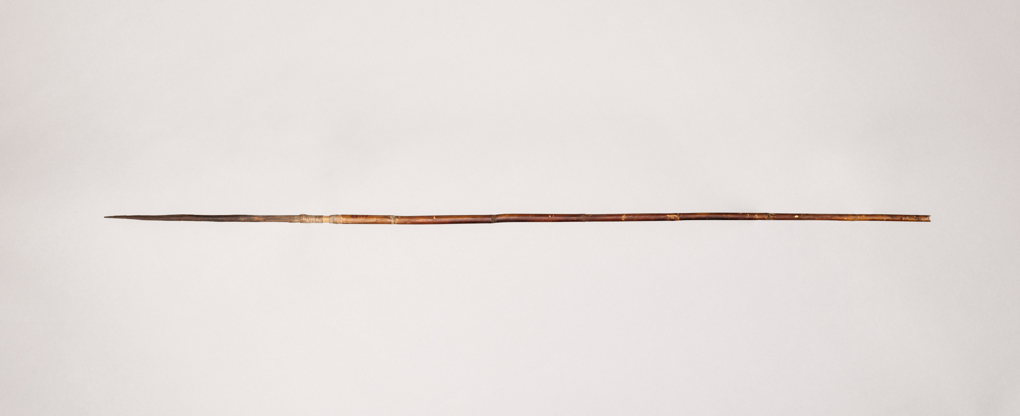 Long, straight, thin, dark brown arrow with a sharp metal point at one end and a light-colored band around the middle on a brown wooden shaft.
