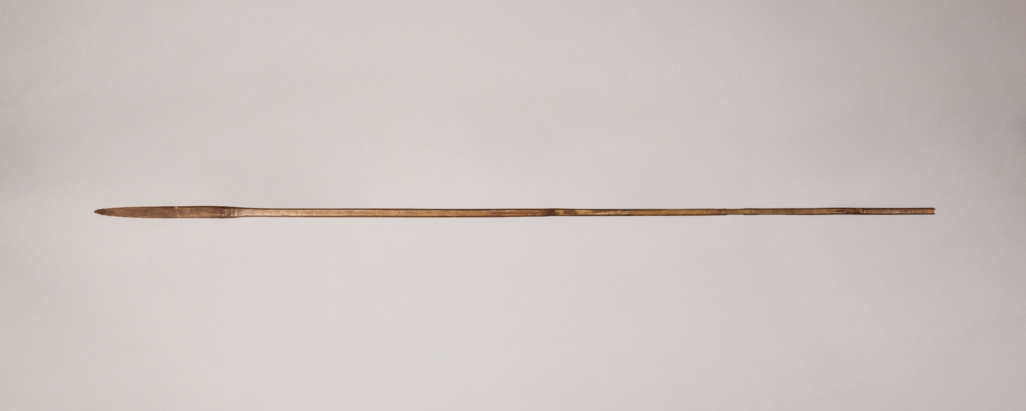 The image titled "Arrow" by the artist depicts a long, thin, straight object made of wood or a similar material with a darker brown color. The object is oriented horizontally. The tip on the left side tapers to a sharp point. A darker band runs along the shaft near the tip. The background is a plain gray color.