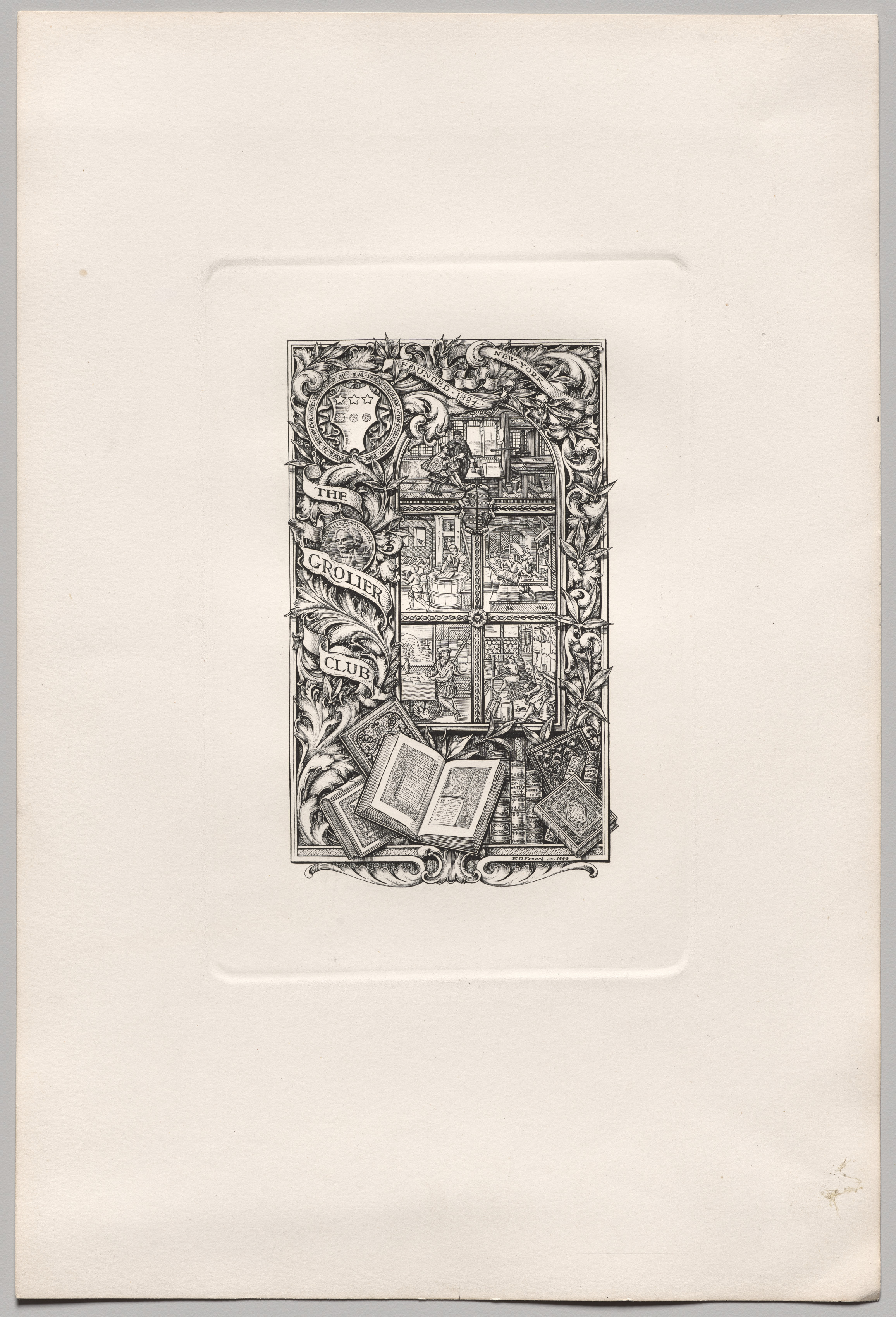 The image shows a black and white bookplate. The bookplate features a rectangular design with a thick border of leaves and vines and is surrounded by a thick white border. Inside the border are several images stacked on top of one another in a grid formation. Top left is a crest with a keyhole. Top center is a checkerboard-like design with a cross in the center and rectangles on either side. Top right is a design with leaves and a rectangle. Middle left shows a woman and a man. Middle center shows another grid design. Middle right shows a man sitting at a desk. The bottom left side of the bookplate reads "The Grolier Club" in a ribbon-like banner. There are also several books in the bottom portion.