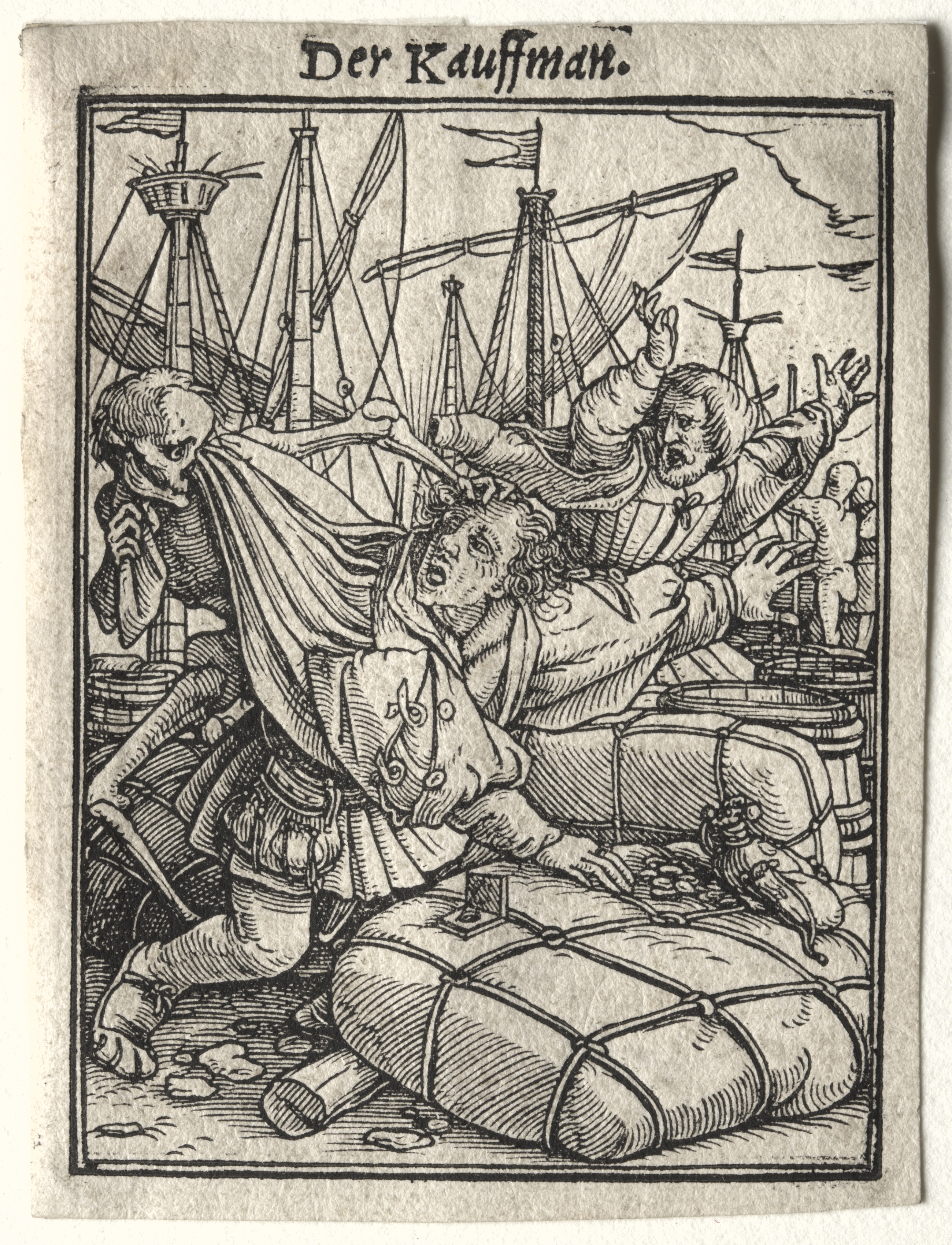 Black and white woodcut image of a merchant being grabbed from behind by Death. The merchant has curly hair, wears a long-sleeved shirt and vest or doublet with buttons; he sits on a pile of barrels or bundles. Death wears a long-sleeved shirt. In the background are ships with multiple masts. The title "Der Kauffman" is written in black text at the top.