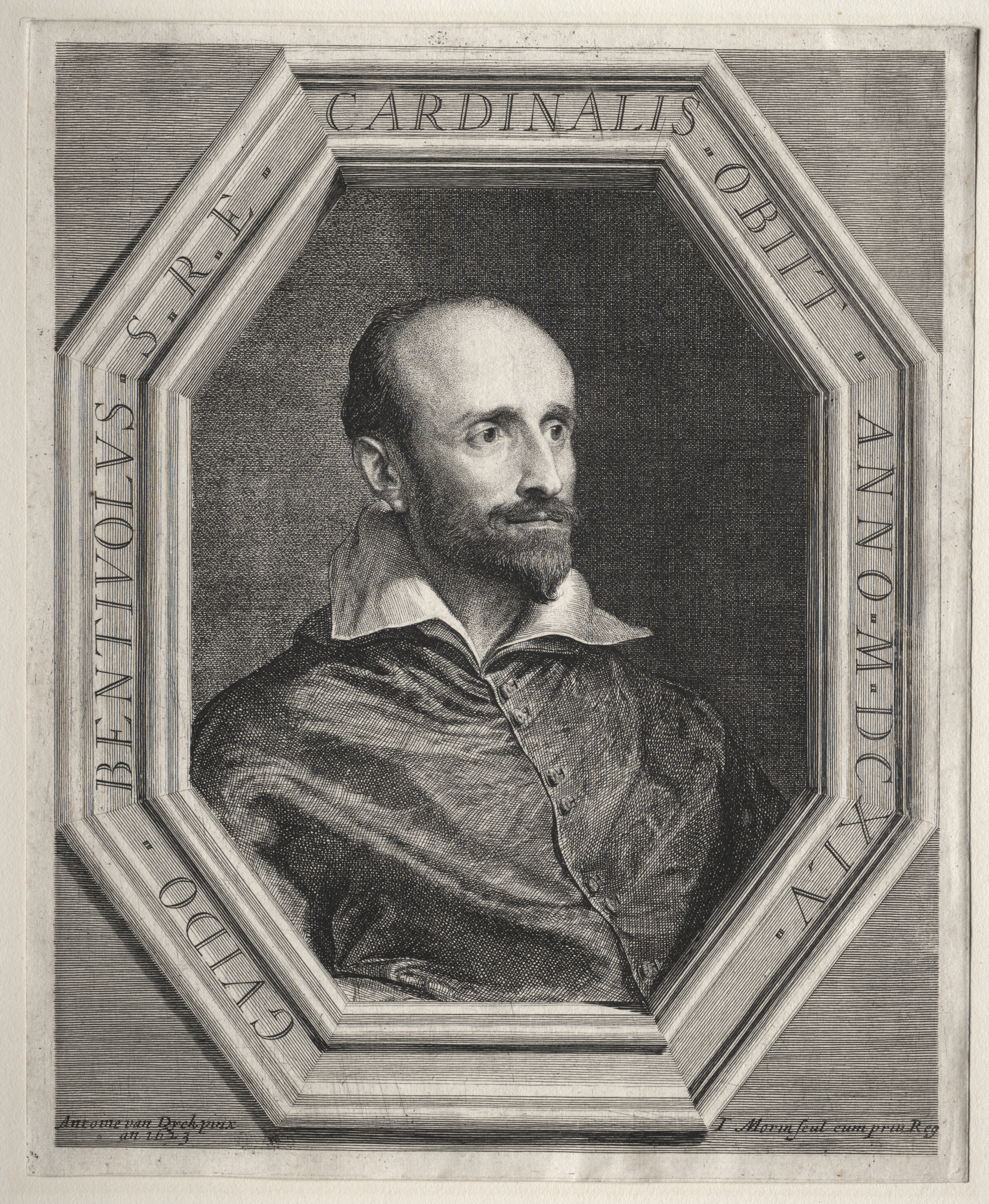 Black and white portrait of a man with a receding hairline and beard, wearing a collared shirt and jacket. The man is shown from the chest up, facing slightly to the right. The portrait is in an octagonal frame with a beveled edge and ridged border. The frame has text on it, reading: - along the top: "CARDINALIS OBIT" - on the left side: "BENTIVOLVS S.R.E." - on the right side: "EPISCOPVS ANTVERNIEN" The background of the image is a light gray color with darker shading behind the portrait. There is small text at the bottom left and right of the image. The overall image is detailed and finely shaded.