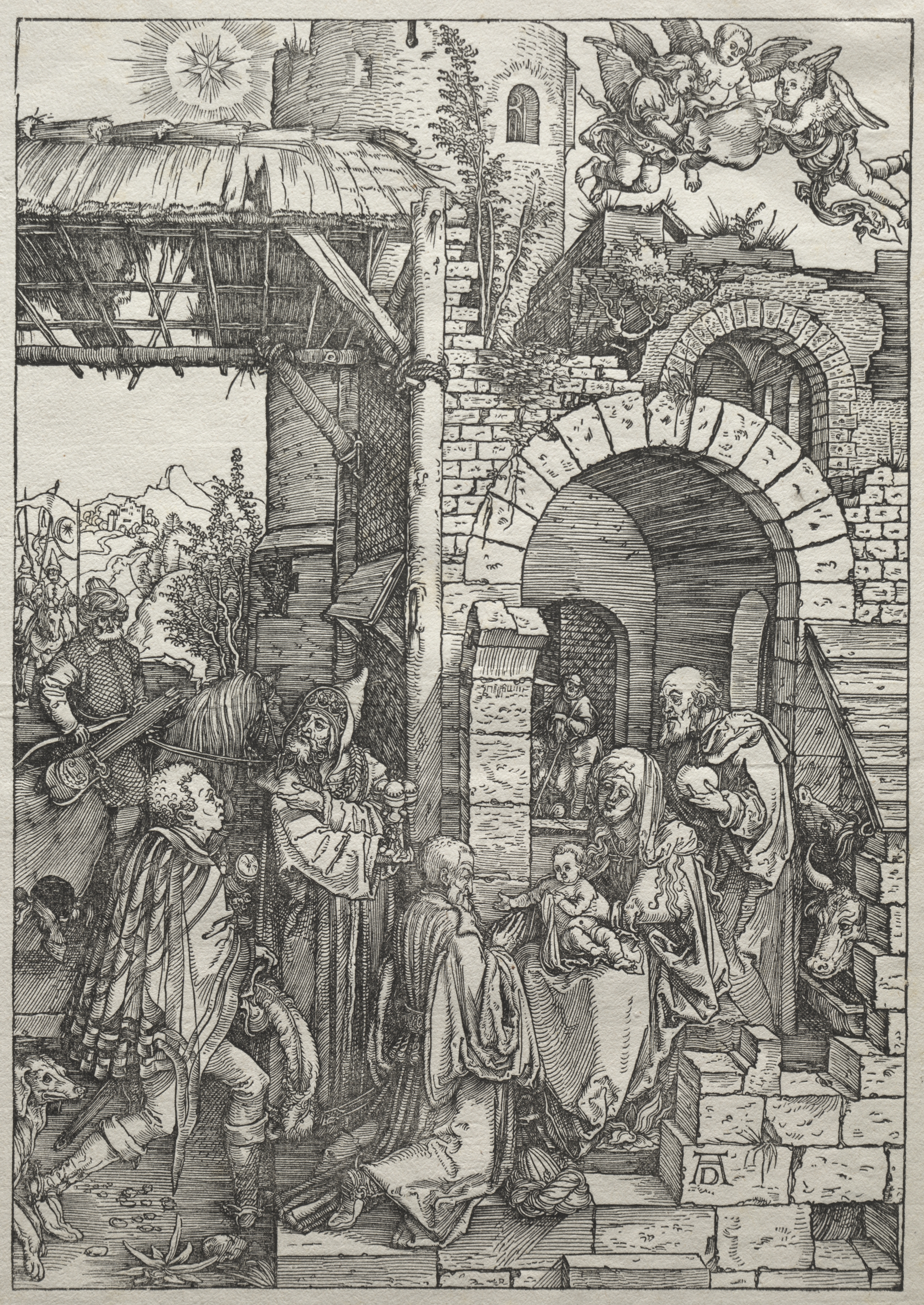 Black and white image of people in old-fashioned clothing. The scene takes place outdoors. A group of people surround a woman and child sitting near a manger with a cow. The people wear long robes or clothing and head coverings. To the left, a man holds a staff and a pot. Another man points to the woman and child. A dog walks next to them. A bearded man and a woman in a head covering stand to the right. A man with a sword walks away from the group on the left. In the background, there are buildings and a bridge. Above, angels fly near a star. The image is framed by a border.