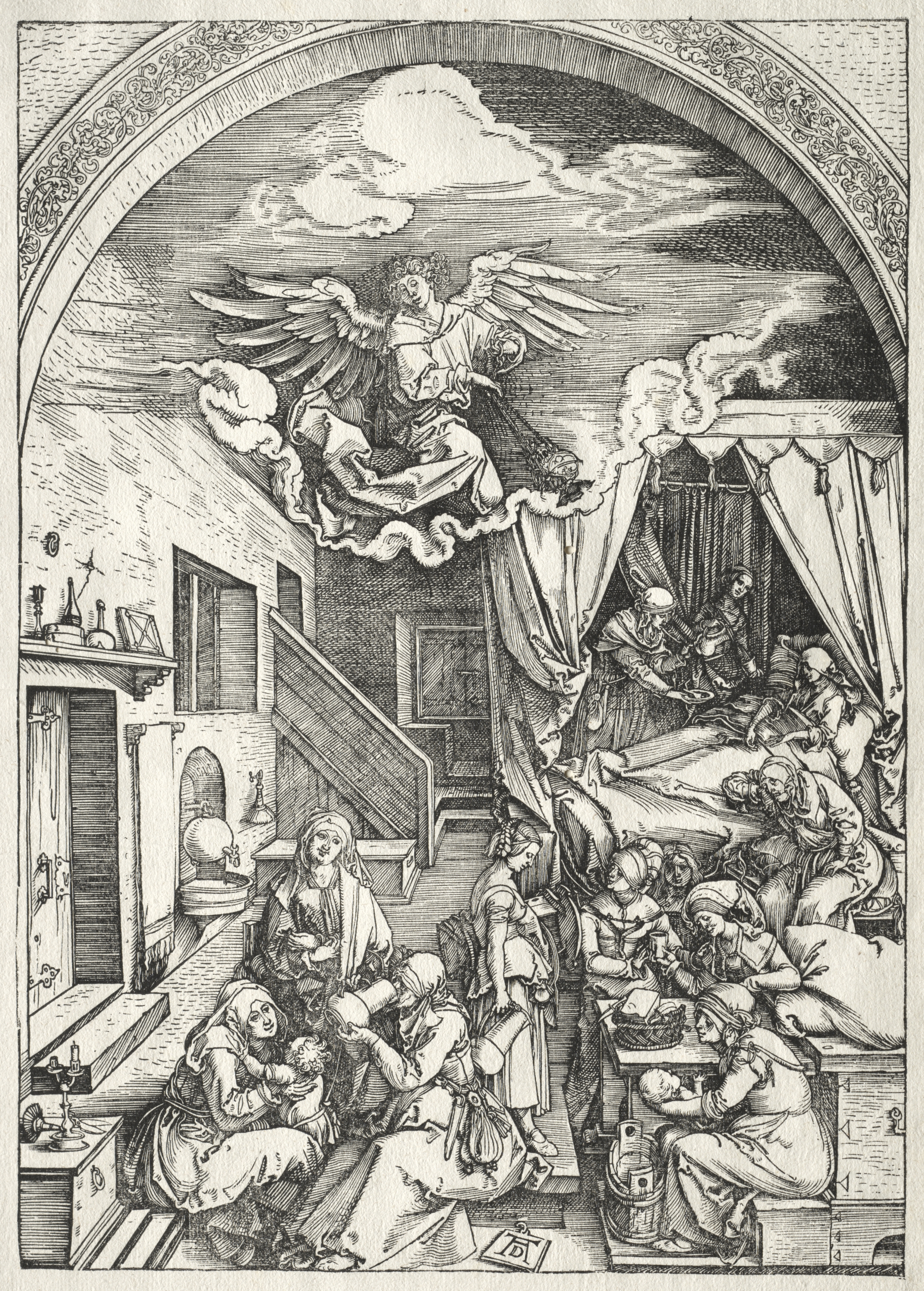 The image depicts a black-and-white engraving of a scene. A large archway frames the top portion. Inside the archway, an angel with wings sits on clouds. Below the archway, a room with a slanted roof and a staircase leading up to a door is shown. In the room, a woman lies in a bed with curtains. A woman sits beside the bed while another woman stands and looks on. The lower part of the room is filled with women. One woman sits on a bench with an infant. A woman on the right sits at a low table. A woman to the left tends to a baby. Other women are engaged in various activities. A doorway with a shelf above it is on the left. The shelf holds various objects. A candle and goblet sit on a table by the door.