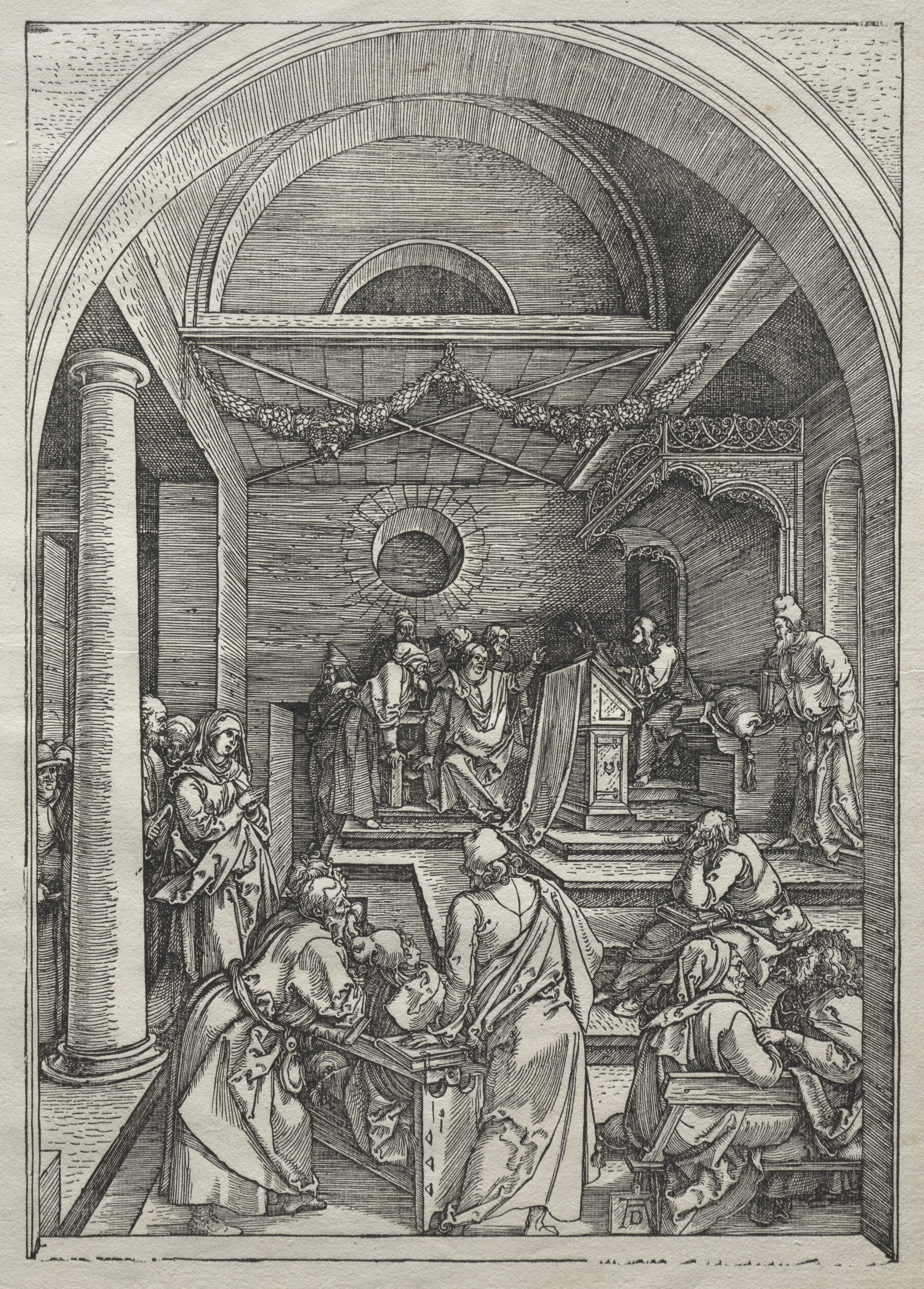 Black and white image of a room with people. The room has stone block walls and vaulted ceiling with ribbed arches. A large archway spans the top of the image. To the left is a column. The room has a tiled floor. There are 13 people in long robes; some sitting and some standing. In the center on a raised platform are 4 people. The child in the center sits on a throne-like chair; he wears a dark cloak. The child holds a scroll in his left hand. The people around the child gesture. The people on the floor write in books or look at the child.