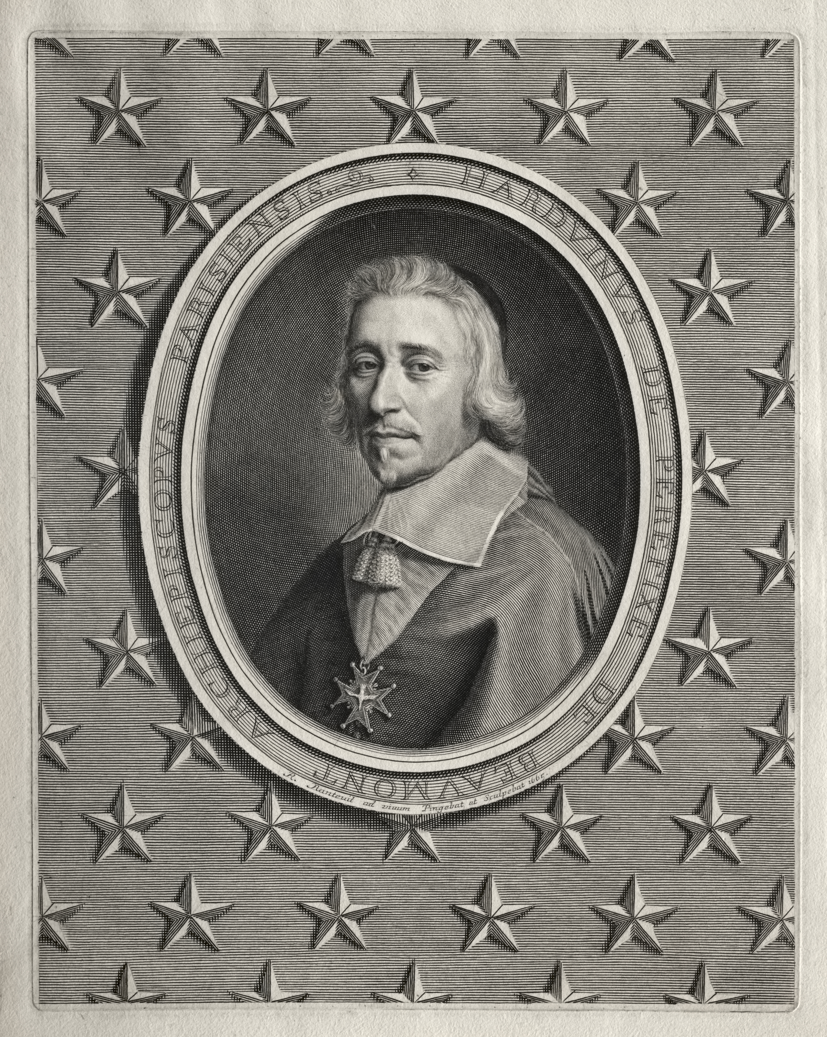 Black and white portrait of a man with shoulder-length light-colored hair, wearing a large collared shirt and a medal on his chest. The man is pictured in an oval frame with a beveled edge and a decorative border. The oval frame is surrounded by a square frame with a star pattern. The image is likely a engraving or etching. The man depicted is Hardouin de Péréfixe de Beaumont, and the artist is Robert Nanteuil.