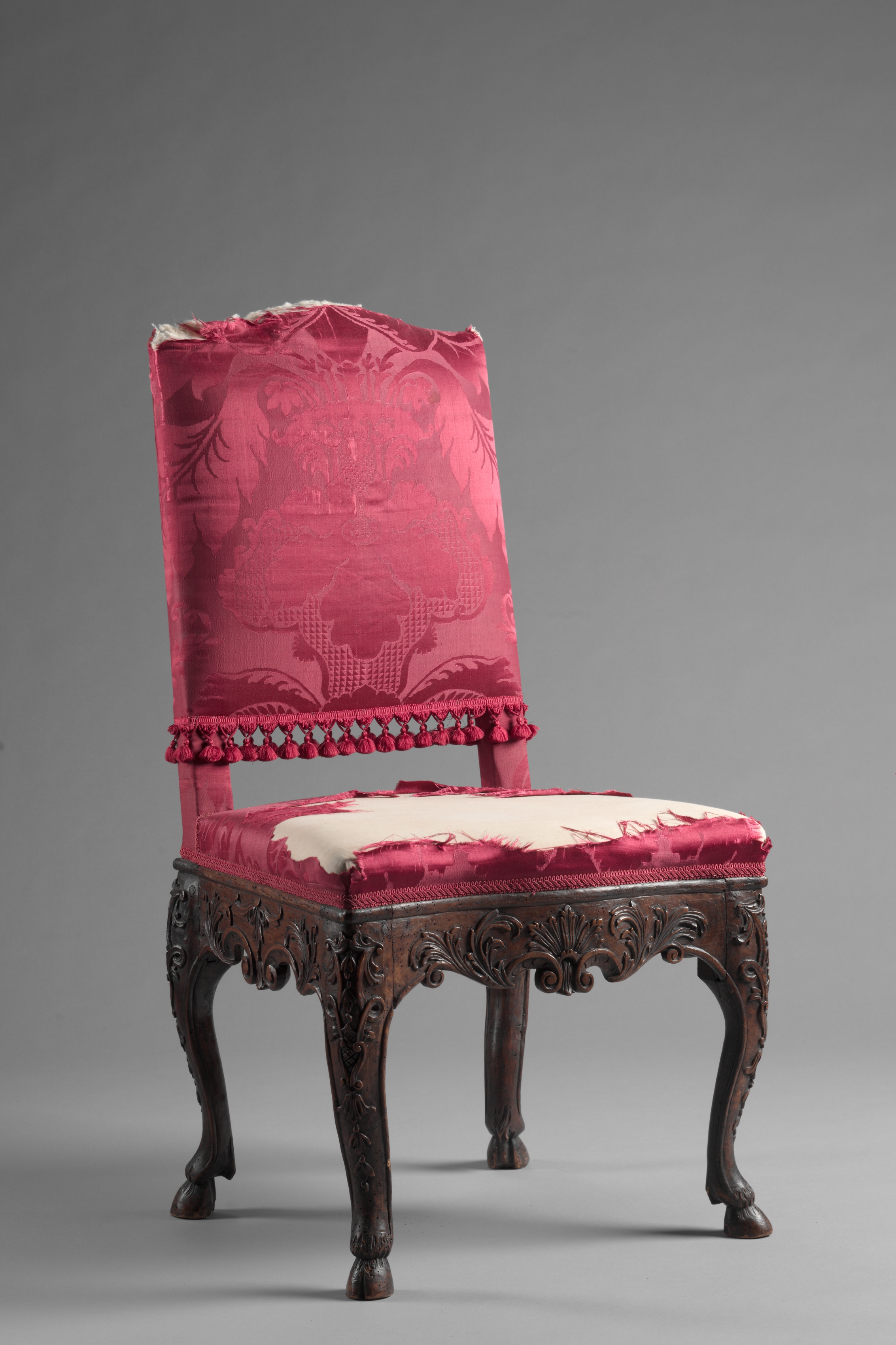 The Side Chair has a dark wooden frame. The chair's four legs are carved with ornate designs and have a curved shape, tapering down to small feet. The seat and backrest are upholstered in a red fabric with a floral pattern. The backrest is tall and slightly curved, with a row of tassels along the bottom edge. A portion of the fabric on the seat appears to be torn or damaged, exposing a white underlayer. The background of the image is a plain gray color. The Side Chair is by an unknown artist.