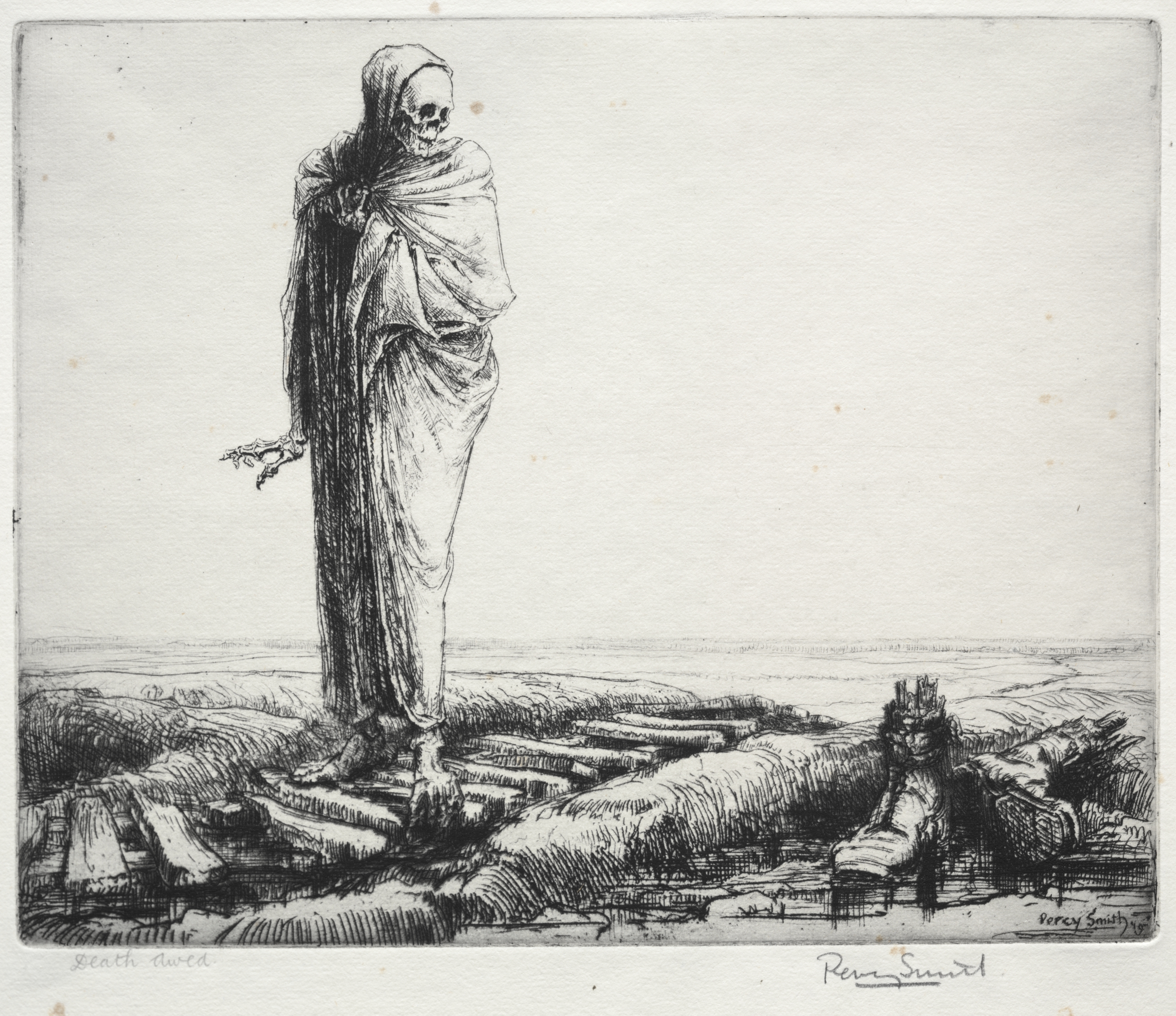 Black and white drawing of a skeleton wearing a hooded robe standing on plowed ground. The skeleton faces to the right. Its right hand is bent at the elbow and its left arm hangs loosely by its side, with the hand curled inwards. The ground beneath it appears uneven and rocky. The horizon line is low, with a vast, flat expanse in the background. The artist's signature appears at the bottom. A title, "Dance of Death: Death Awed by Percy John Delf Smith", relates to the drawing.