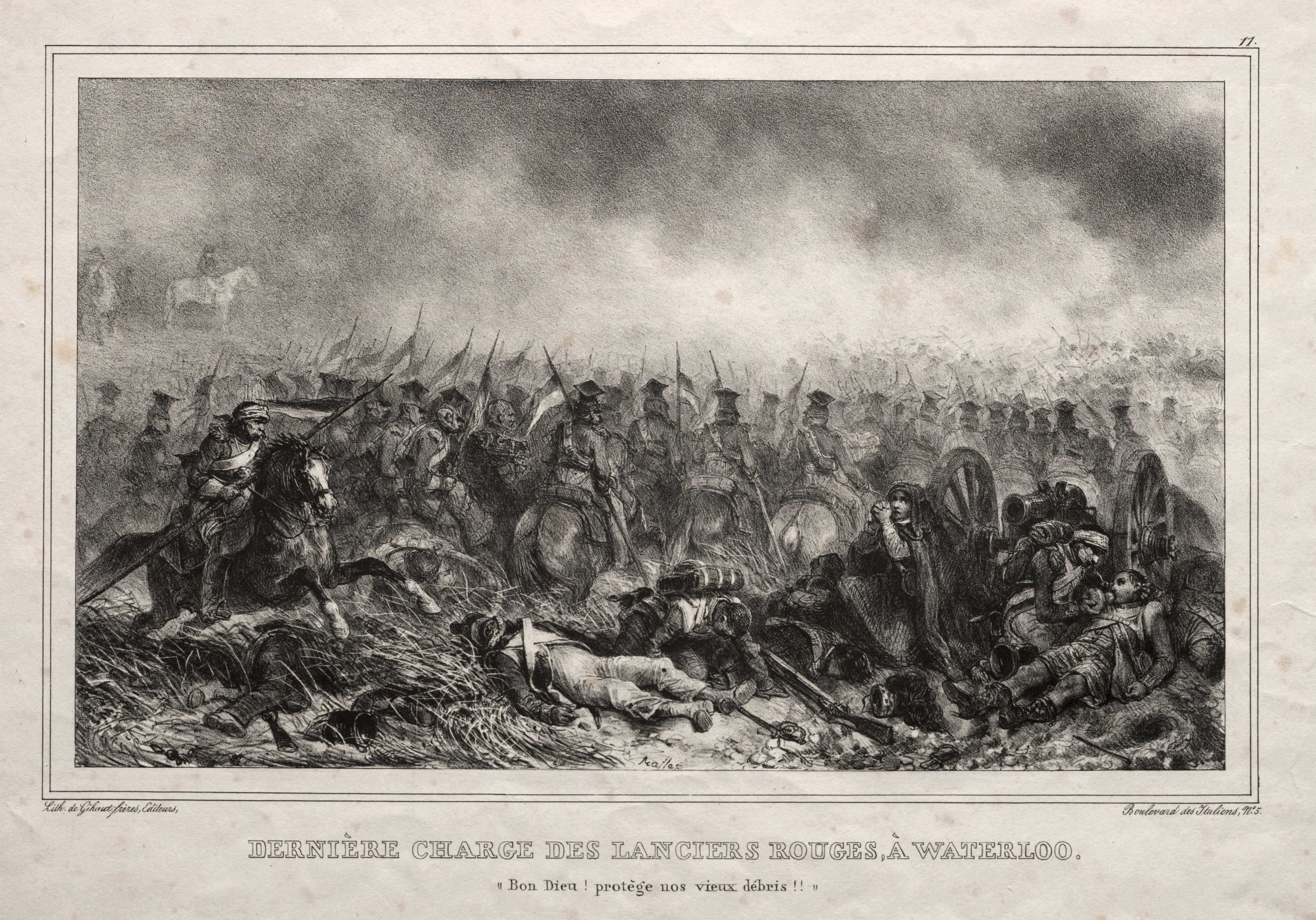 Black and white drawing of a battle scene. Soldiers on horses and on foot scattered throughout. Mostly men wearing uniforms with tall, flat hats. Some men on ground, some dead or wounded, others standing or on horseback. Swords, spears and cannons present. Smokey background with dark clouds. Caption at bottom in a foreign language. Image on a beige background with darker spots. Thin black border surrounds image. Number "11" in upper right corner. Small cursive writing in bottom corners.