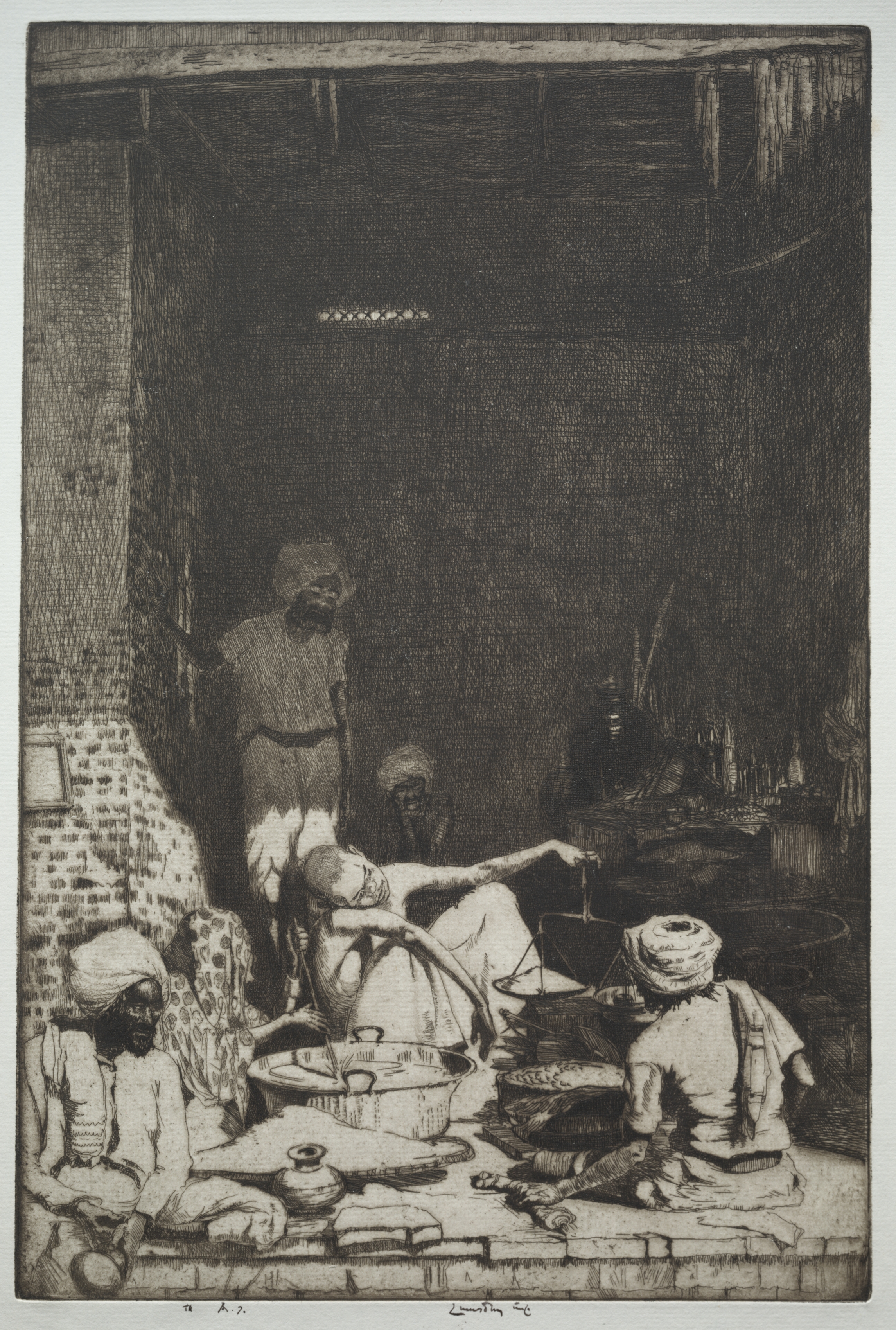 The image depicts a black and white drawing titled "The Scales" by Ernest Stephen Lumsden. The scene shows four men, all wearing turbans and long-sleeved shirts, in an interior room. The room features a brick wall on the left side and a wooden ceiling. The men are gathered around a low table or platform. One man on the left sits cross-legged on the floor; another man stands behind him. A central figure sits on the floor, holding an object in his right hand. A fourth man sits on the right side of the image. Several objects are present on the floor, including a large bowl and a jug. The background is dark, with some indistinct objects visible. The overall atmosphere appears dimly lit.