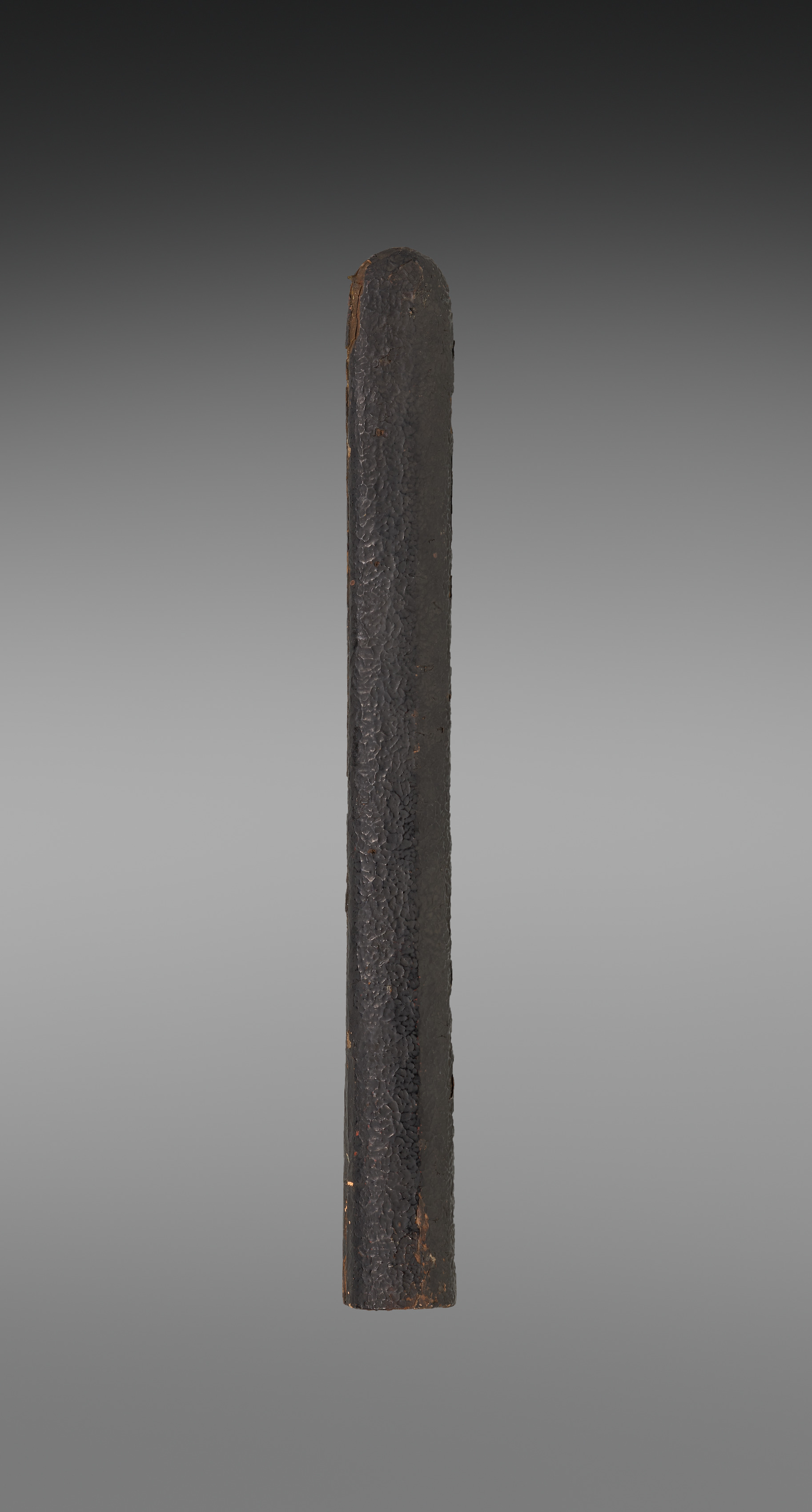Dark gray, cylindrical object with rough texture, rounded top and bottom edges, vertical ridges and small orange spots, on a gradient background transitioning from black to light gray. Sheath by artist unknown.