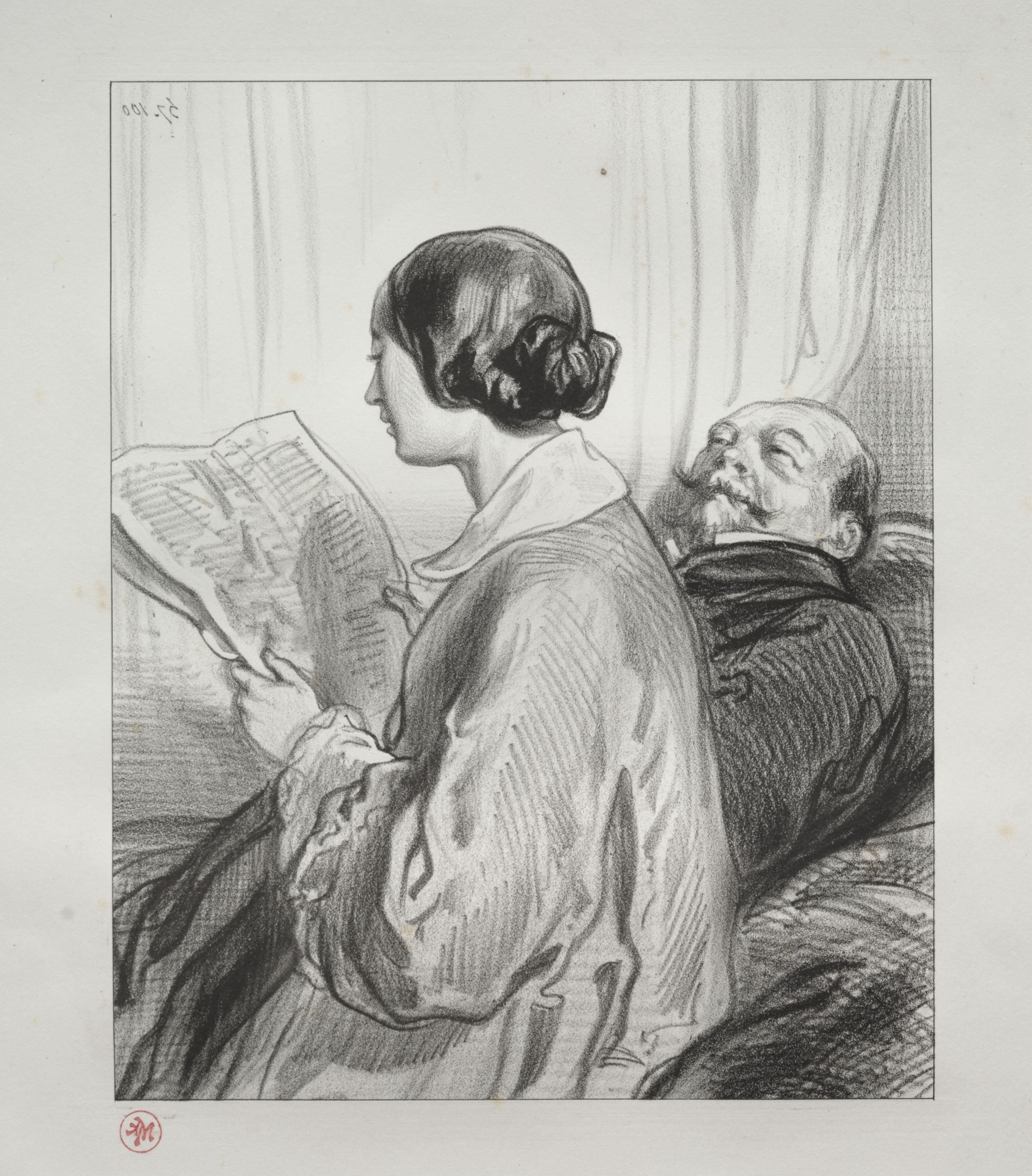 The image is a black-and-white drawing of a woman and a man. The woman sits on the left side of the image; she has dark hair pulled back into a bun and wears a long-sleeved, collared shirt with ruffles on the cuffs. She holds a newspaper in her hands. The man reclines on the right side, resting on what appears to be a couch; he wears a dark jacket. The background features a wall with white curtains. A red monogram is in the bottom-left corner of the drawing.