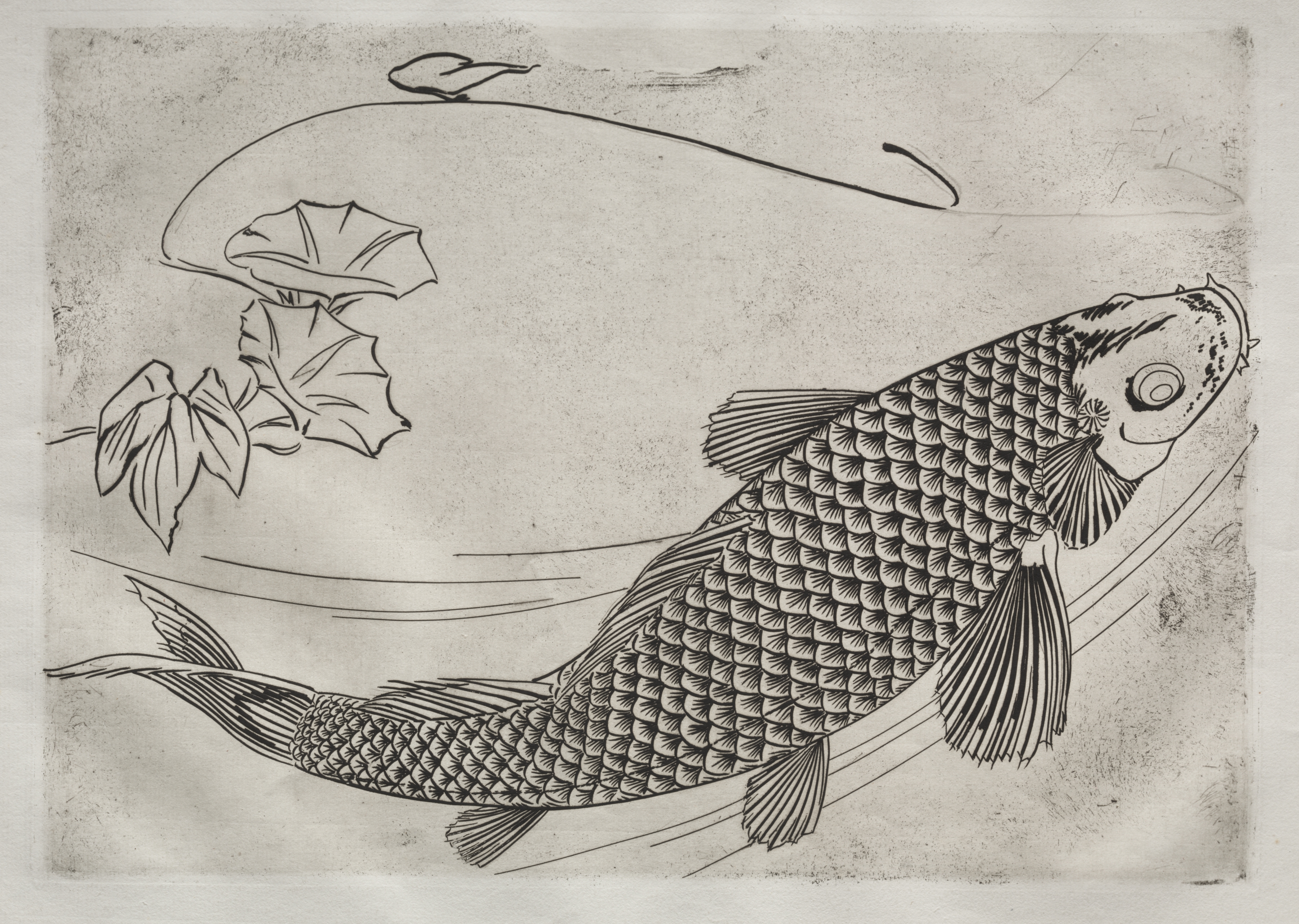 Black and white image of a fish. The fish has a large body with scales covering it. The scales are detailed and have lines radiating from the center. It has a large eye, two fins on its back, and one on its bottom. The fins have lines on them. A stem with leaves comes from the left. The background behind the fish is light gray with darker shading around the edges. The fish swims in a curved line.