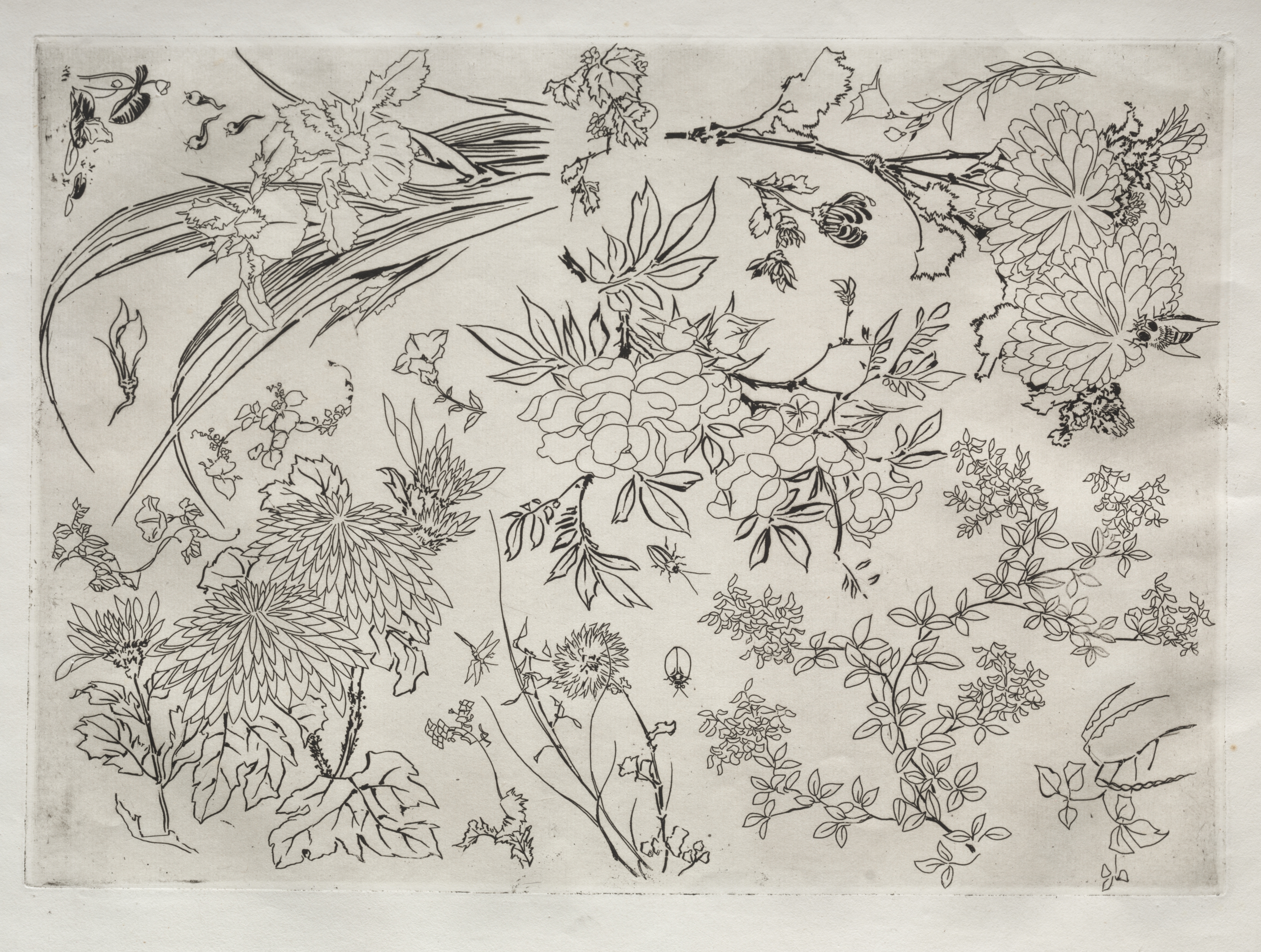 Black and white drawing on off-white background. Various plants, flowers, leaves and stems. Flowers have many petals. Some plants have buds. Stems are curved and straight. Leaves are oval and pointed. Small insects present. Plants densely arranged. Border around drawing slightly darker.