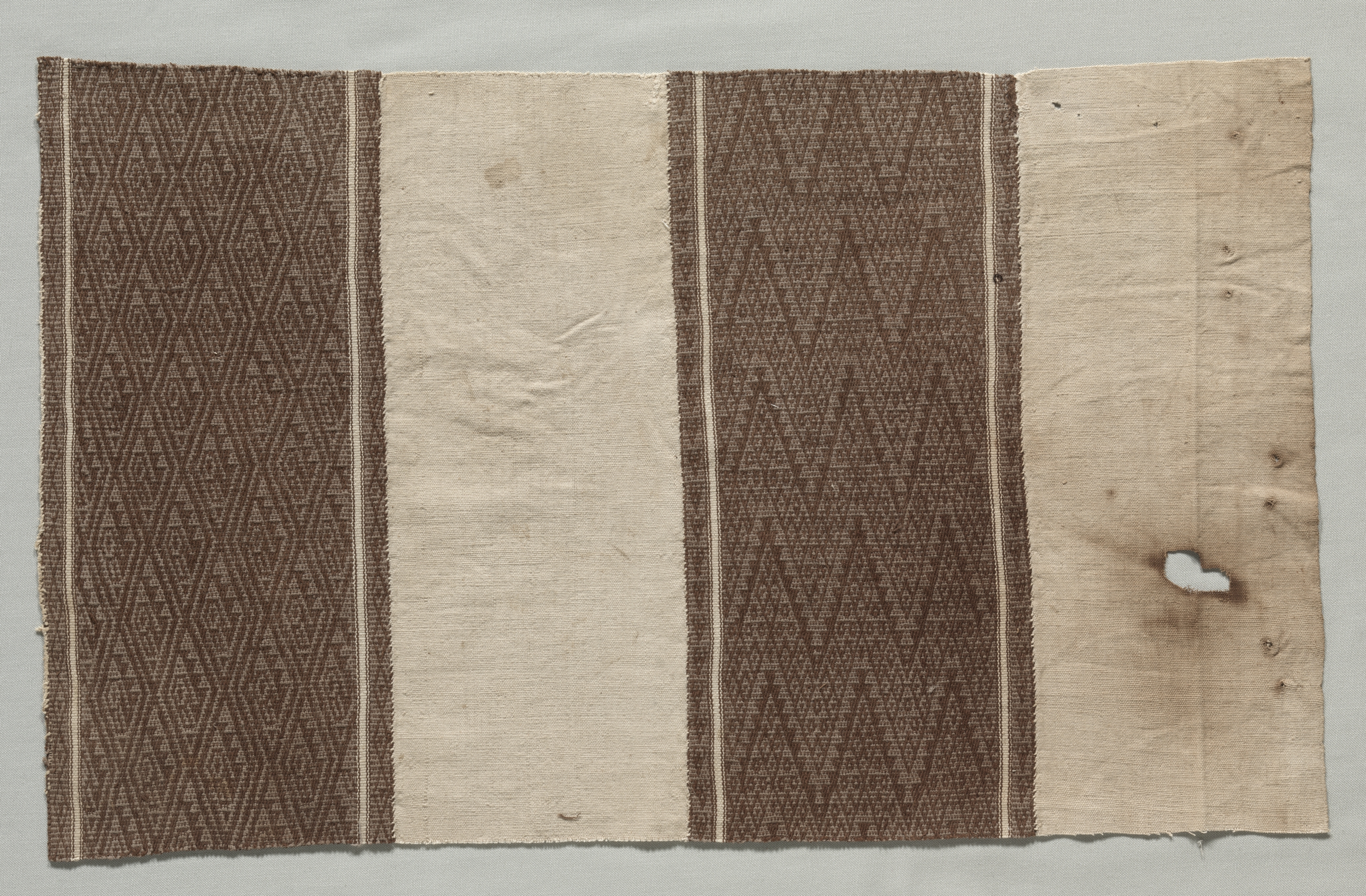 The image shows a rectangular piece of fabric comprising four separate sections. The fabric is oriented horizontally. The left and middle-right sections have a brown color; the middle-left and right sections are beige. The left and middle-right brown sections have a repeating diamond pattern. The left and right sections are beige; the middle-left section appears stained. The right beige section features a burnt hole near the bottom-right corner. The fabric's edges are rough and frayed. The background of the image is light gray. The title of the piece is "Fragment formed of Four Separate Fabrics Joined". The artist is not specified.