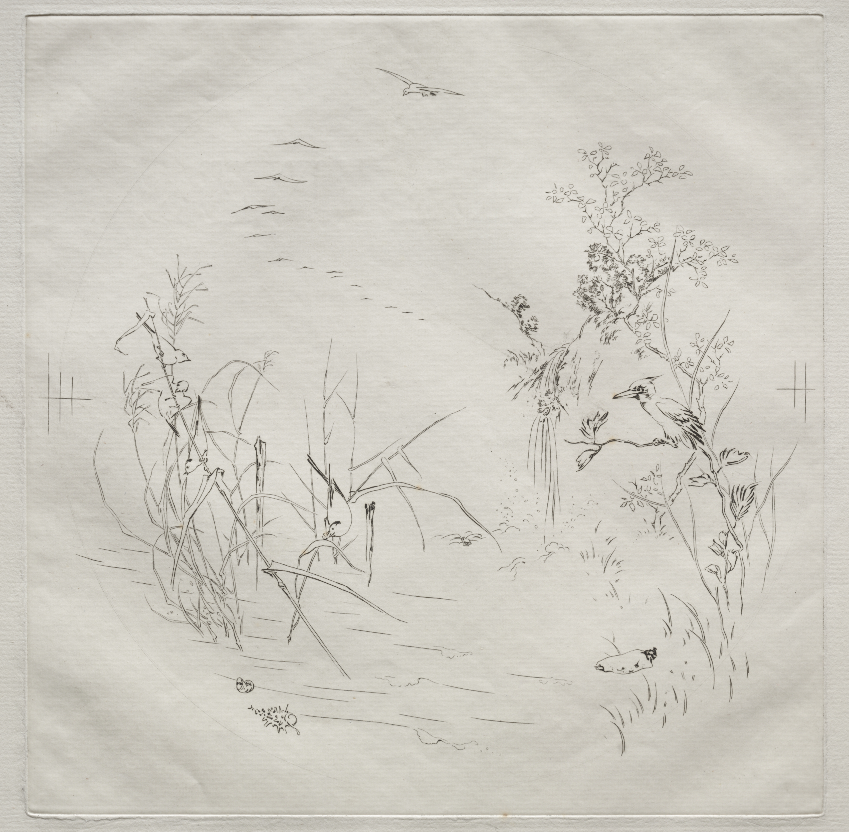 Pencil drawing on white fabric. The drawing depicts a landscape with grasses and plants on either side. On the right, a bird sits on a tree branch; another creature swims in the water below. On the left, a large plant sits in front of a hill; a bug sits on the ground. Multiple birds fly in the sky, which takes up the top half of the image. The entire image is surrounded by a thin border with plus signs at each corner.
