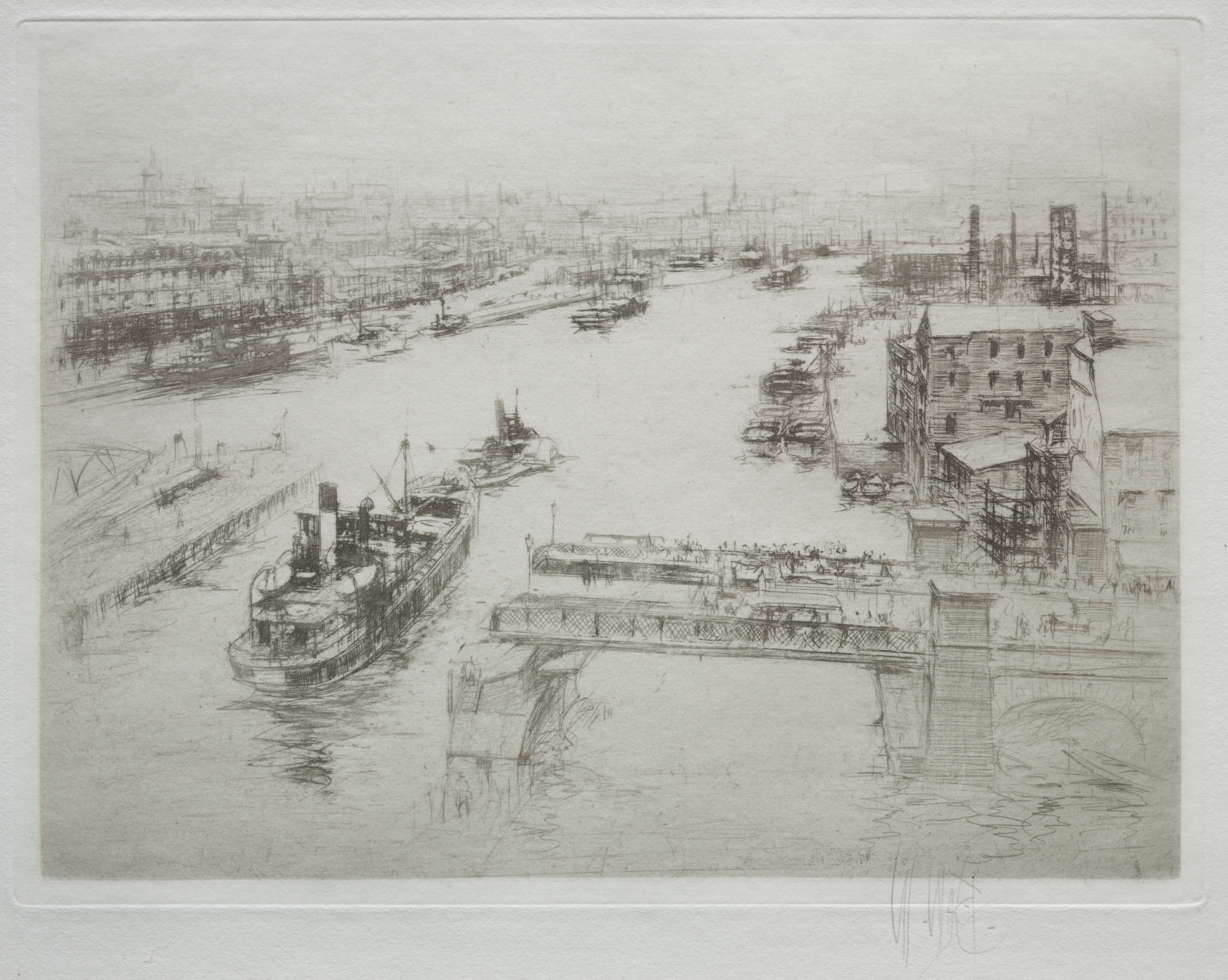 The scene depicts a river with a bridge in the foreground and a cityscape in the background. The river runs vertically through the center of the image, with a bridge spanning it near the bottom. A large boat is docked on the left side of the river. Several other boats are scattered throughout the river. On the right side of the river, there are several buildings, including a large one with a flat roof. The sky above is overcast. The entire scene is rendered in shades of gray, suggesting it may be an etching or drypoint print.