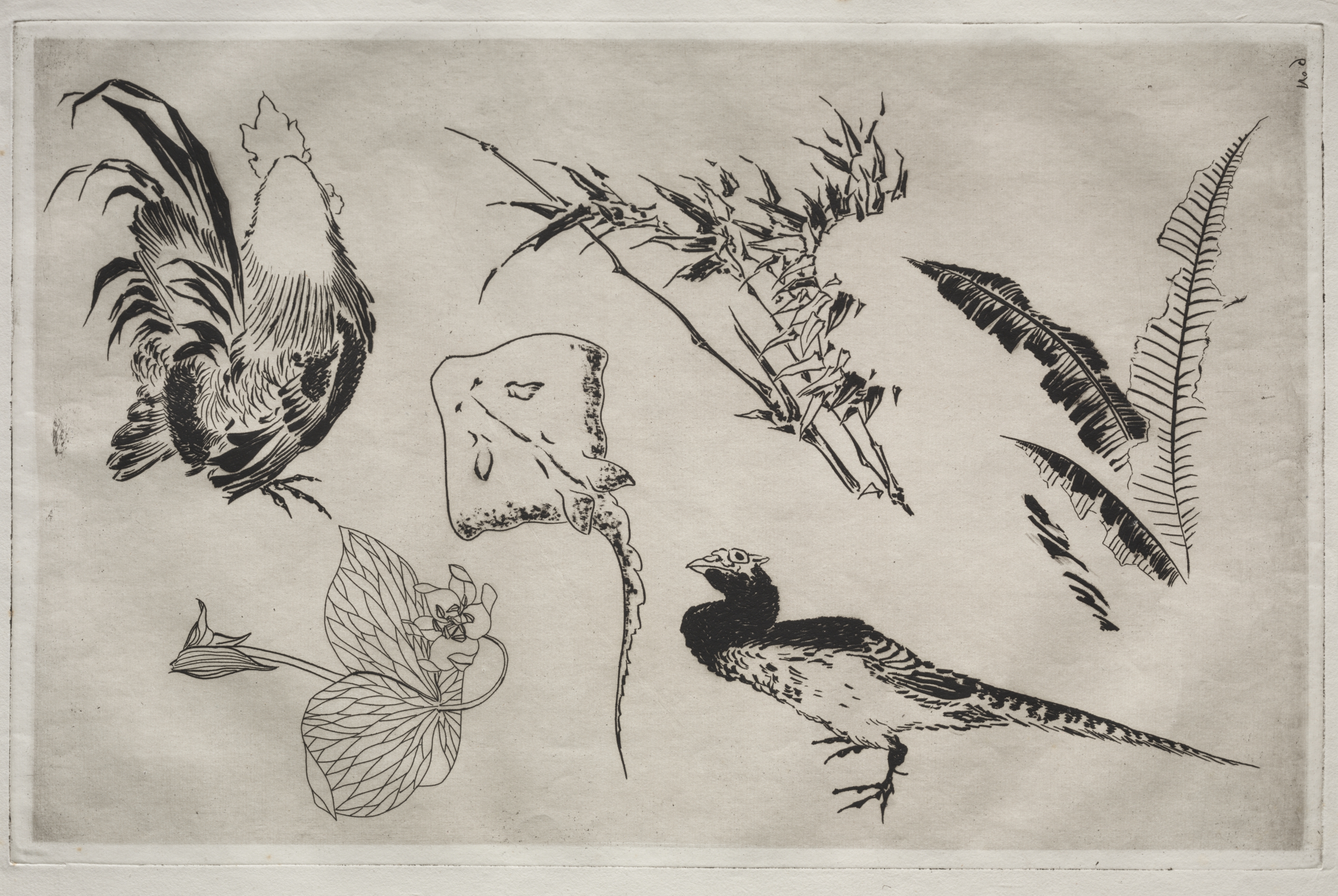 Black and white illustration on light gray background. Left side: a rooster facing left with tail feathers raised. Under the rooster: a flower with large leaves and a closed bud. Center: skate fish with long thin tail pointing down. Right side from top to bottom: a plant with thin branches and no leaves; three long thin feathers; one large feather. Bottom right: a bird facing left with long tail. The composition is scattered with no unifying frame. The style is detailed and realistic.