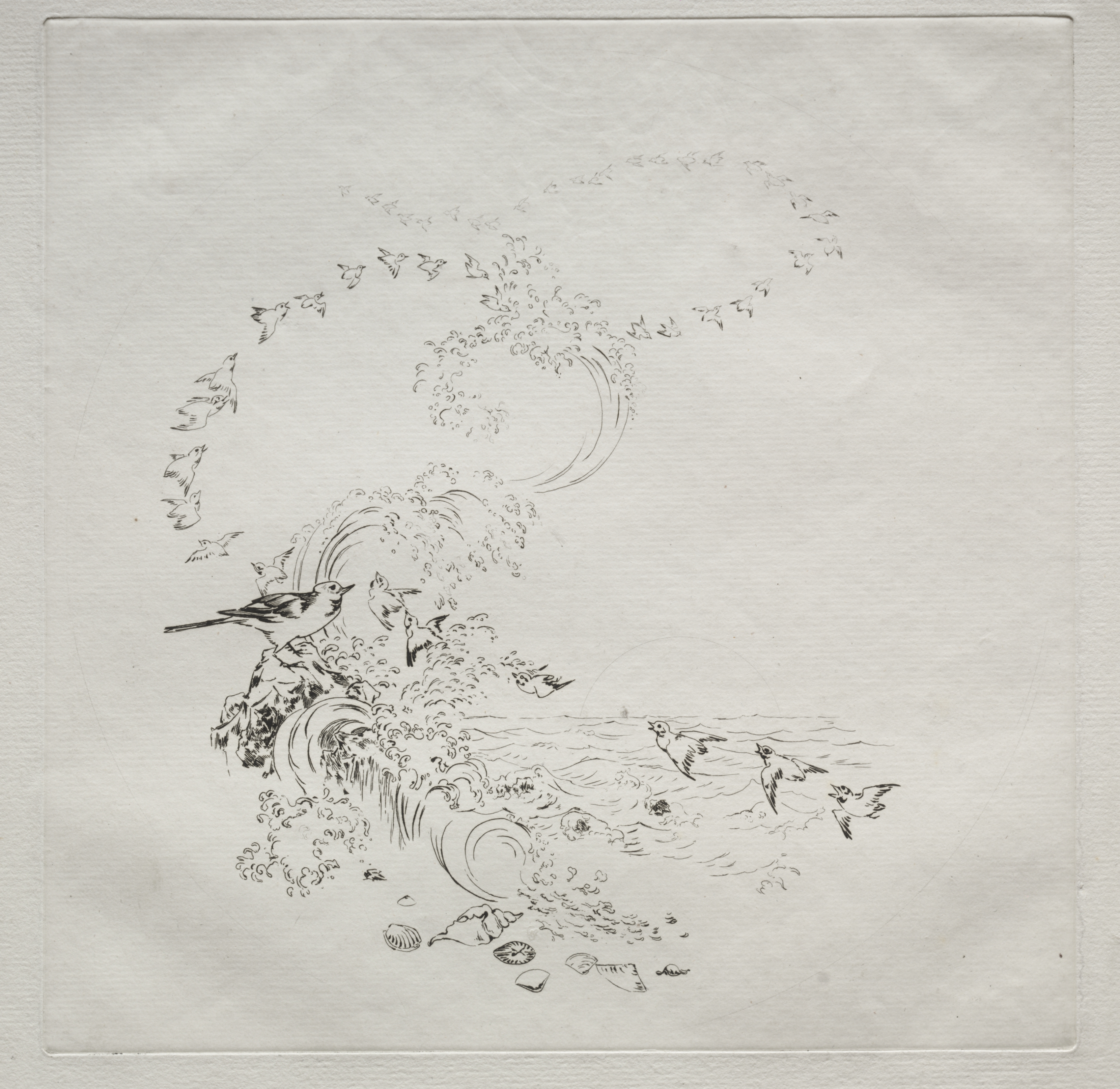 A black and white drawing on a textured white background. A large wave dominates the image, drawn in a Japanese style with curved lines. The wave starts at the bottom-left and curves up to the top-center. It has seaweed and shells at the bottom. Several birds are flying around the wave, some in the air and some on the wave. The wave and birds are drawn with thin lines and minimal shading. The background is a plain white color with a subtle texture. The drawing is rectangular and centered on the background.