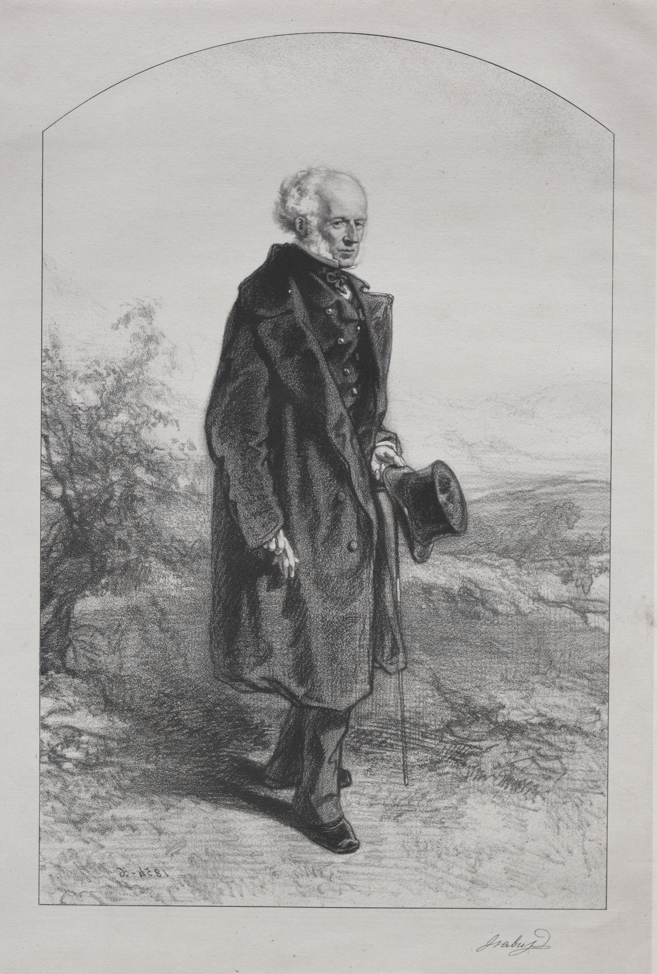 Black and white drawing of a standing man. The man has white receding hair and a white goatee. He wears a long black coat with a fur collar. He holds a top hat in his right hand and a cane in his left hand. He wears a vest with six buttons and a necktie. A tree and outdoor landscape are behind the man. The man faces to the right. The drawing is in an arch shape. The title is "Isabey" and the artist is "Paul Gavarni".