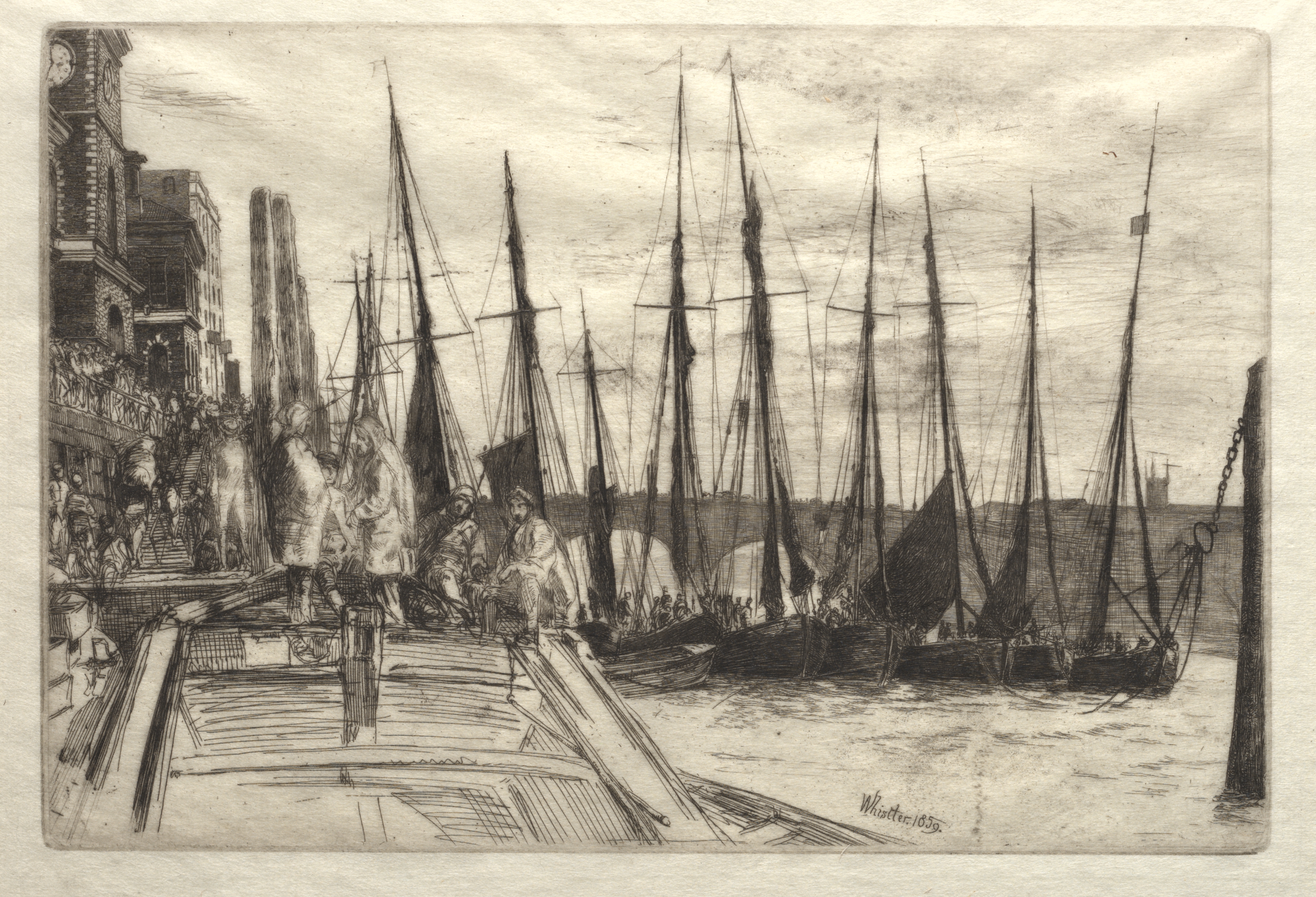 Billingsgate by James McNeill Whistler. A dock with wooden planks is in the foreground, extending into a body of water. Several large boats or ships with tall masts are docked. Three people are on the dock near the water. A crowd of people is on a raised walkway to the left. A large brick building with a clock tower is on the left side. The sky is cloudy. The artwork is in black and white.