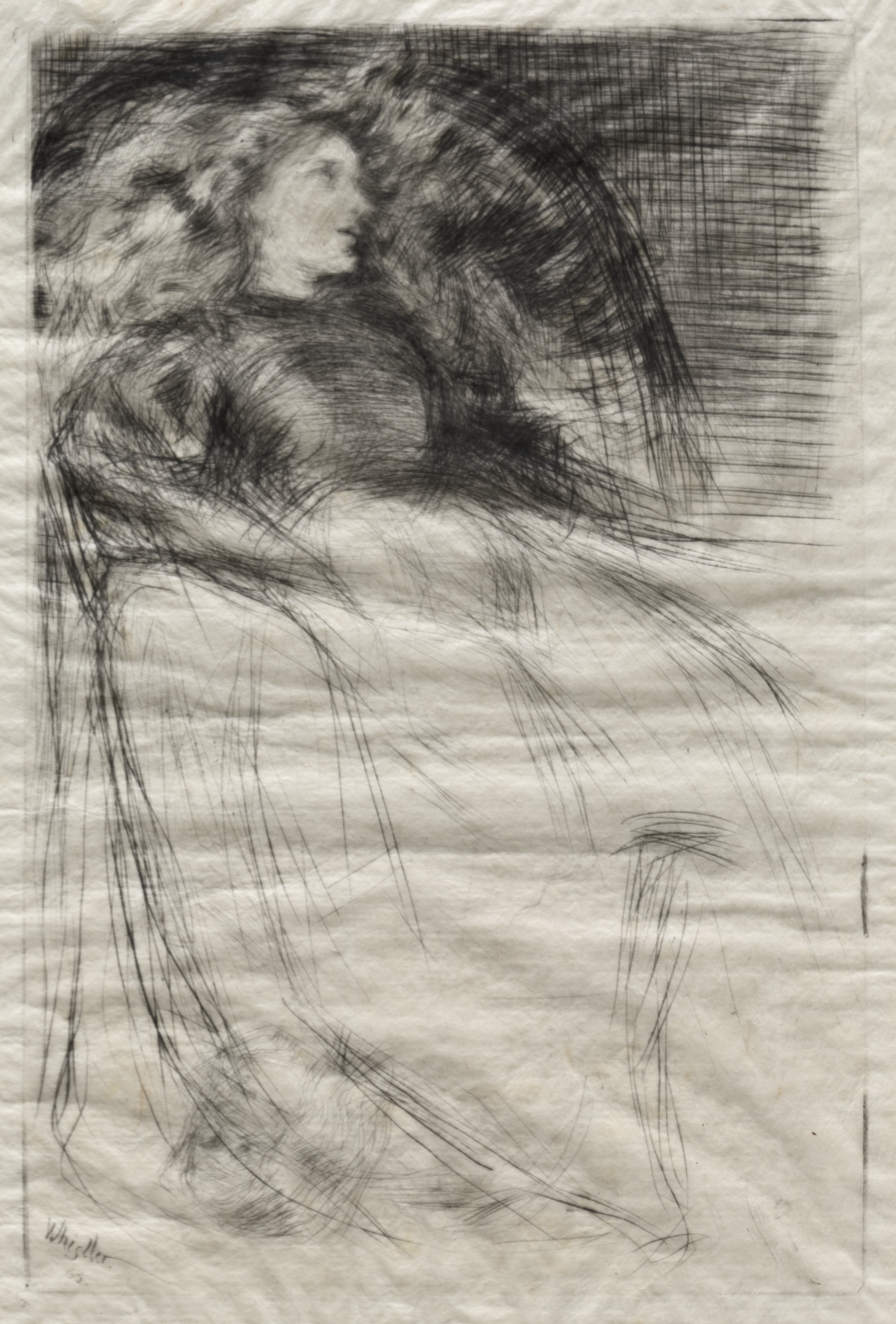 Black and white sketch of a woman with long hair on a wrinkled white background. The woman is drawn in profile, facing right. Her hair is blowing back and appears to be long and unkempt. Her facial features are simple. She appears to be wearing a dress with thin straps. Her arms are down by her sides. Her right leg is slightly bent. The background is shaded darker at the top. The artist's signature is in the bottom-left corner.
