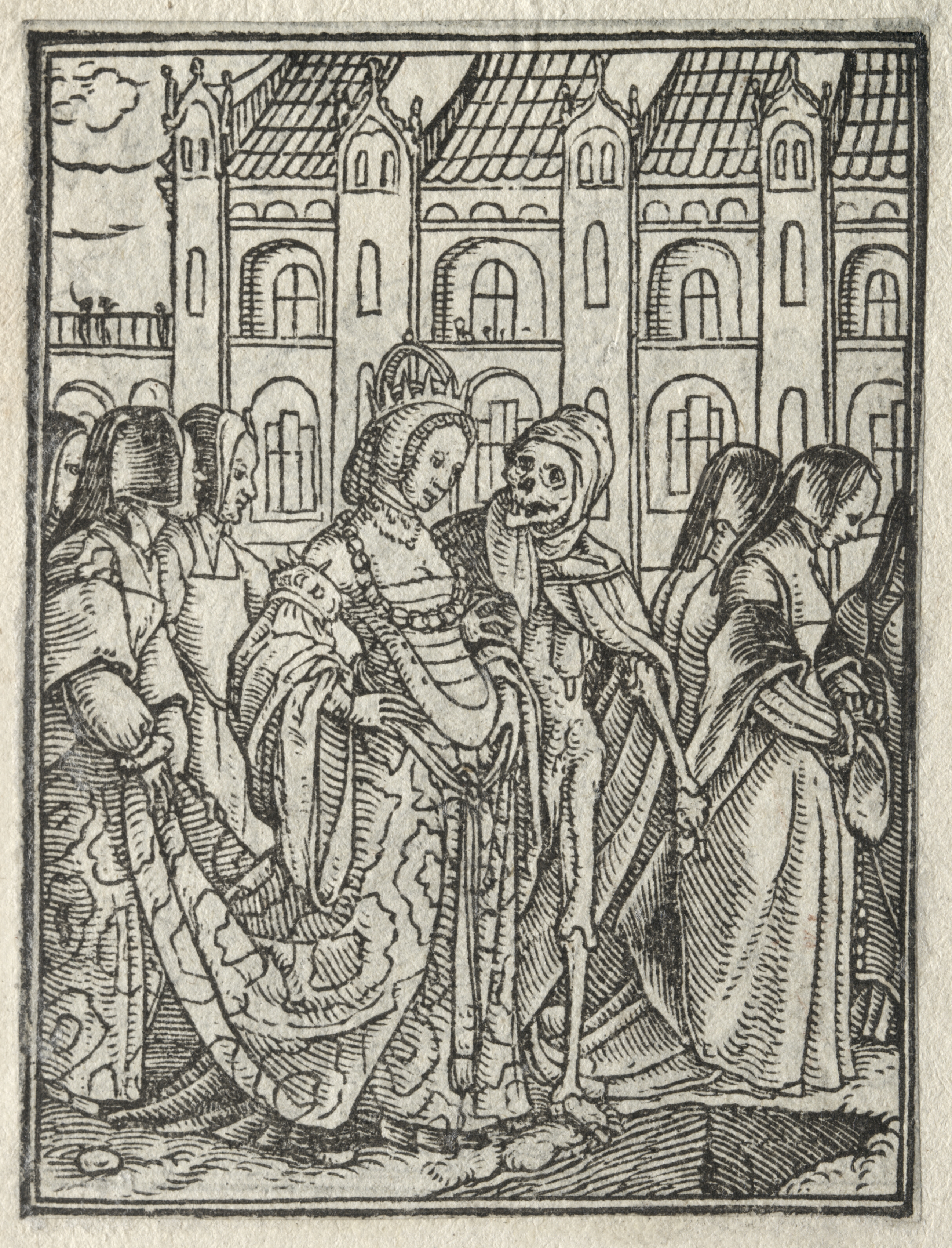 Black and white drawing of a woman in a dress and head covering being led away by a skeleton wearing a head covering. The woman wears a large dress with a ruffled edge, a necklace made of pearls, and a crown. The skeleton holds her hand on the left and a staff in the right. A man on the left wearing a cap looks on. A woman on the right in a long dress and head covering looks on. A large building with many windows and towers is in the background.